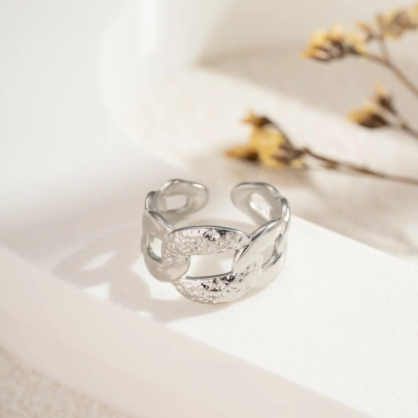 Anello in acciaio inossidabile argentato, con motivo a catena rivisitato con texture martellata. Regolabile e confortevole, si adatta a tutte le taglie. Gioiello femminile dallo stile contemporaneo, ipoallergenico e durevole. Perfetto per un look minimalista o deciso. Accessorio di tendenza, ideale come regalo o per valorizzare le tue mani con un tocco scultoreo e urbano. In Acciaio Inossidabile, Senza Nichel, senza Cadmio e senza Piomb