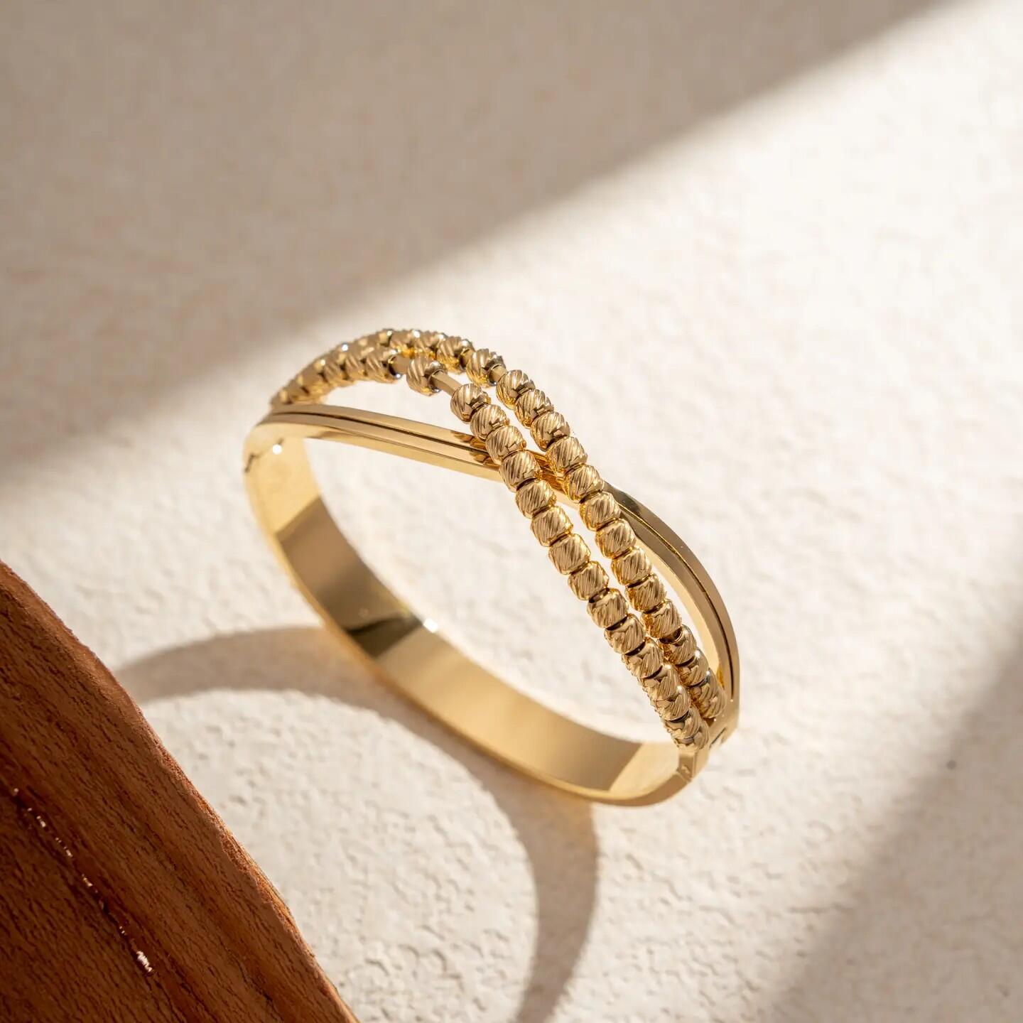 Questo bracciale dorato da donna affascina per la sua texture sottile e il suo splendore raffinato. Che sia rigido, flessibile o ornato di ciondoli, incarna l'eleganza senza tempo e la luce dorata. Gioiello di tendenza e versatile, sublima ogni polso con delicatezza. Da indossare da solo o in accumulo, diventa un essenziale luminoso del quotidiano.