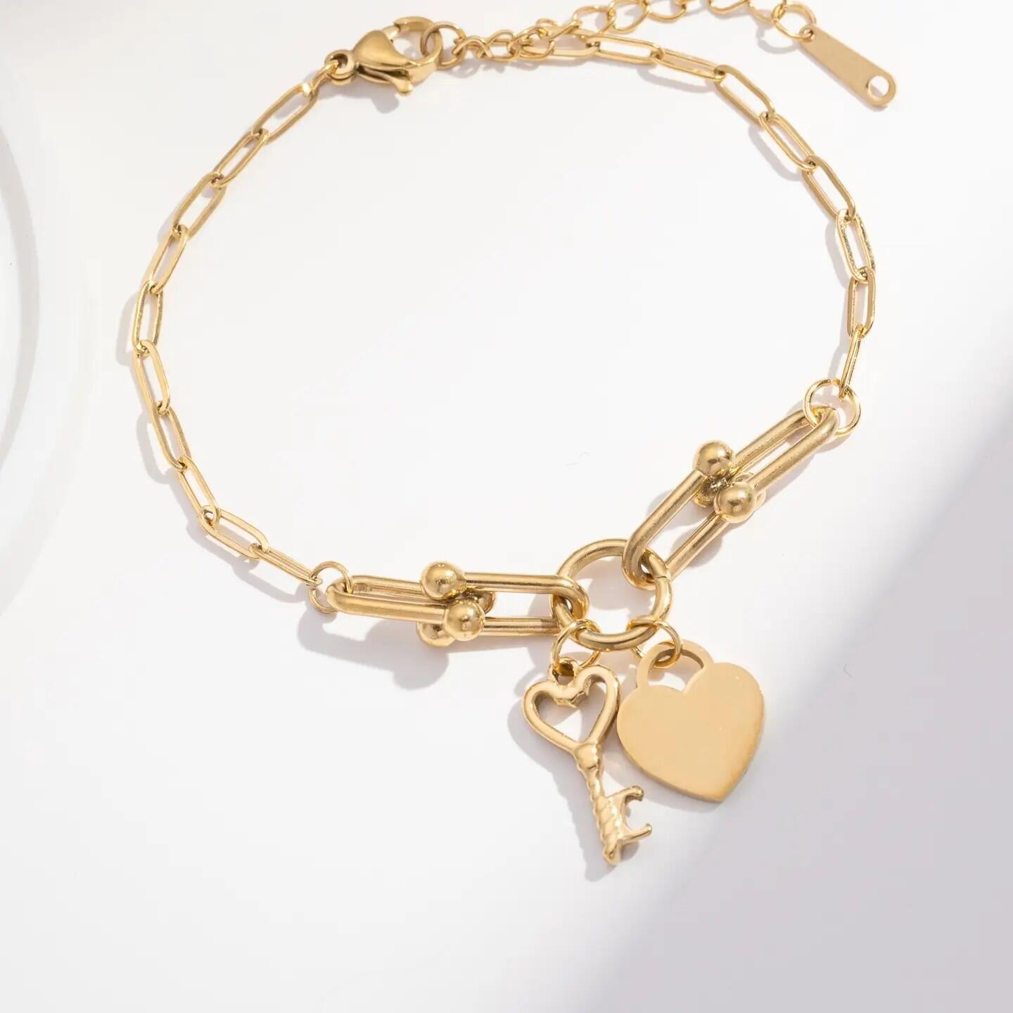 Questo bracciale dorato in acciaio inossidabile affascina con la sua catena elegante e i suoi due charm simbolici: un cuore e una chiave, evocazione sottile dell'amore e del mistero. La sua chiusura a moschettone e la catena regolabile garantiscono un comfort perfetto. Resistente, ipoallergenico e luminoso, si adatta a tutti gli stili, dal romantico al moderno. Un gioiello delicato da regalare o regalarsi, per chi ama gli accessori carichi di significato e fascino.