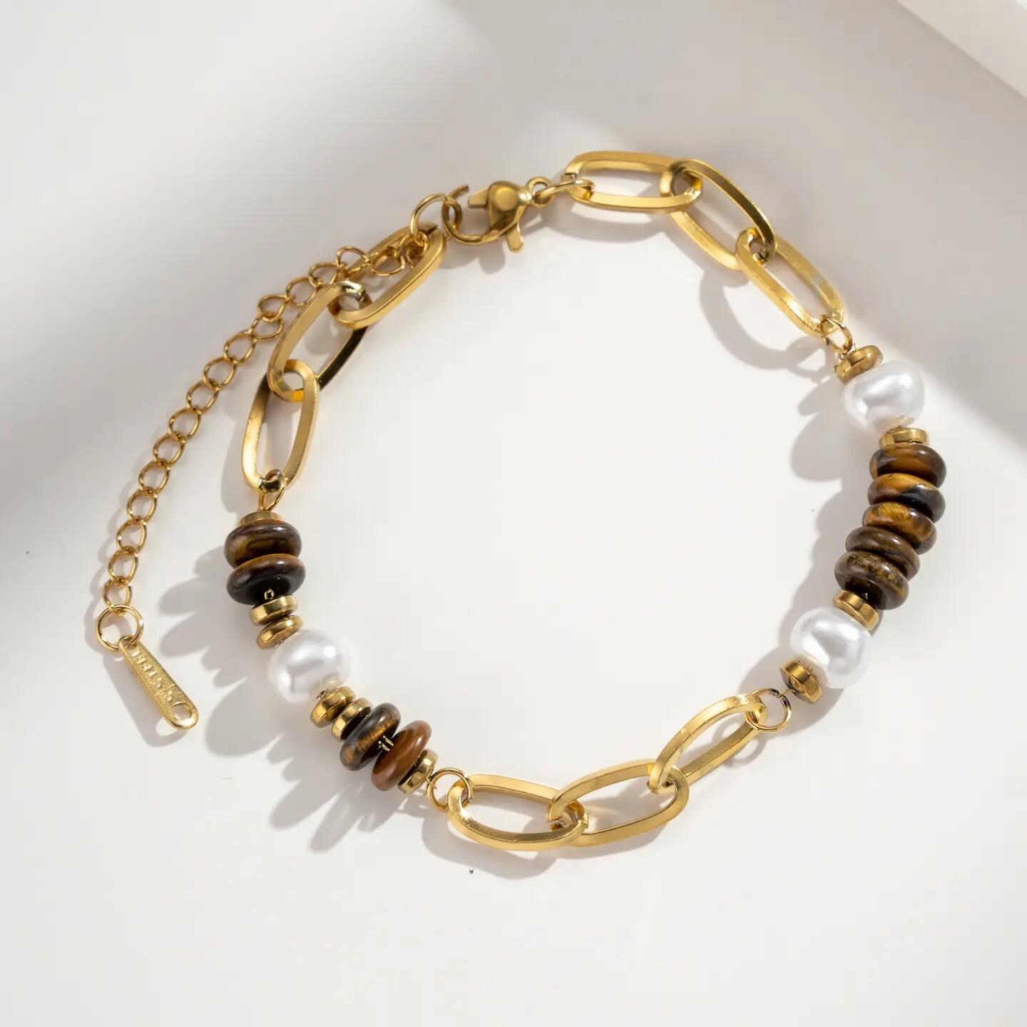 Questo bracciale dorato in acciaio inossidabile combina maglie ovali, perle di madreperla e pietra occhio di tigre dai riflessi profondi. Il suo design audace e raffinato evoca la forza interiore e l'eleganza naturale. Ipoallergenico e resistente all'acqua, si adatta a tutti i polsi grazie alla sua catena regolabile. Ideale per le amanti dei bracciali dorati con pietre protettive, incarna l'alleanza tra energia minerale e stile deciso.