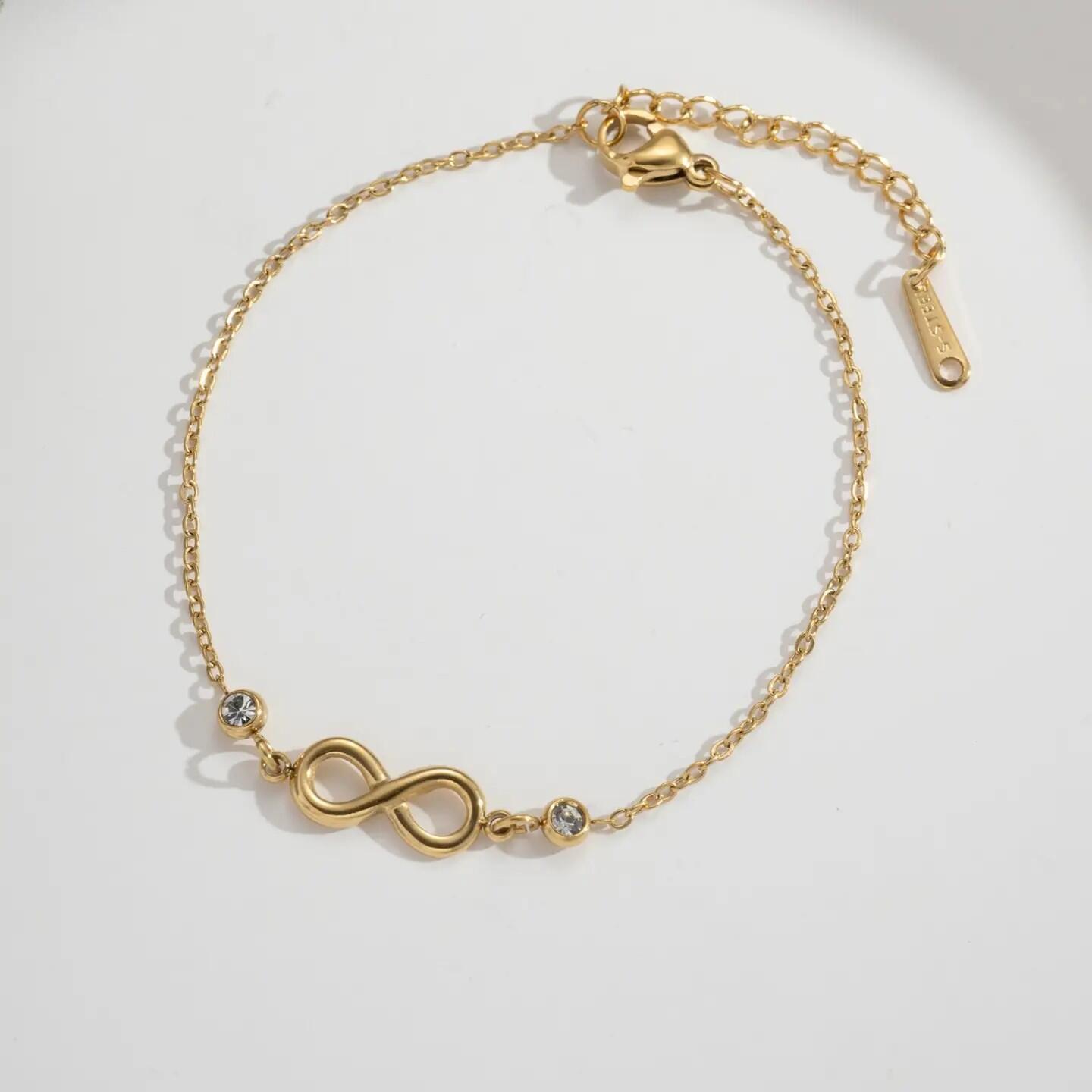 Questo bracciale dorato in acciaio inossidabile celebra l'infinito con delicatezza. Il suo simbolo centrale, affiancato da pietre chiare, incarna l'amore eterno e la connessione profonda. Regolabile, ipoallergenico e luminoso, offre uno stile raffinato e durevole. Gioiello senza tempo per donne in cerca di significato, perfetto per regali affettuosi o abiti eleganti.