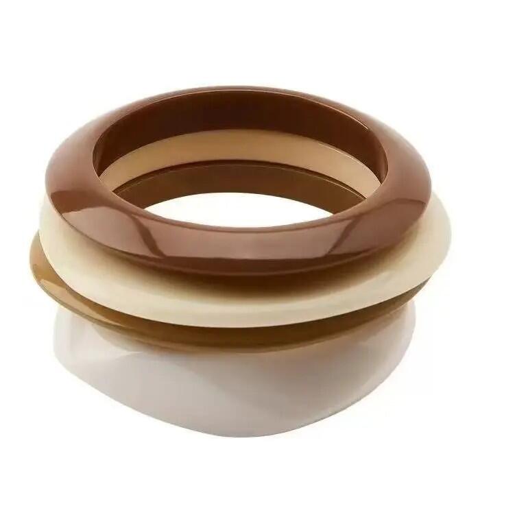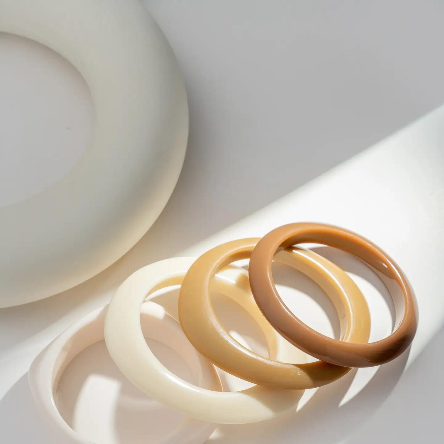 Questo set di 4 braccialetti in resina offre un gioco sottile di sfumature in tonalità naturali: beige, caramello, ambra e avorio. Combinando le forme, apportano un tocco grafico e moderno ai tuoi look. Leggeri e confortevoli, si indossano da soli o in accumulazione per un effetto artistico e di tendenza.