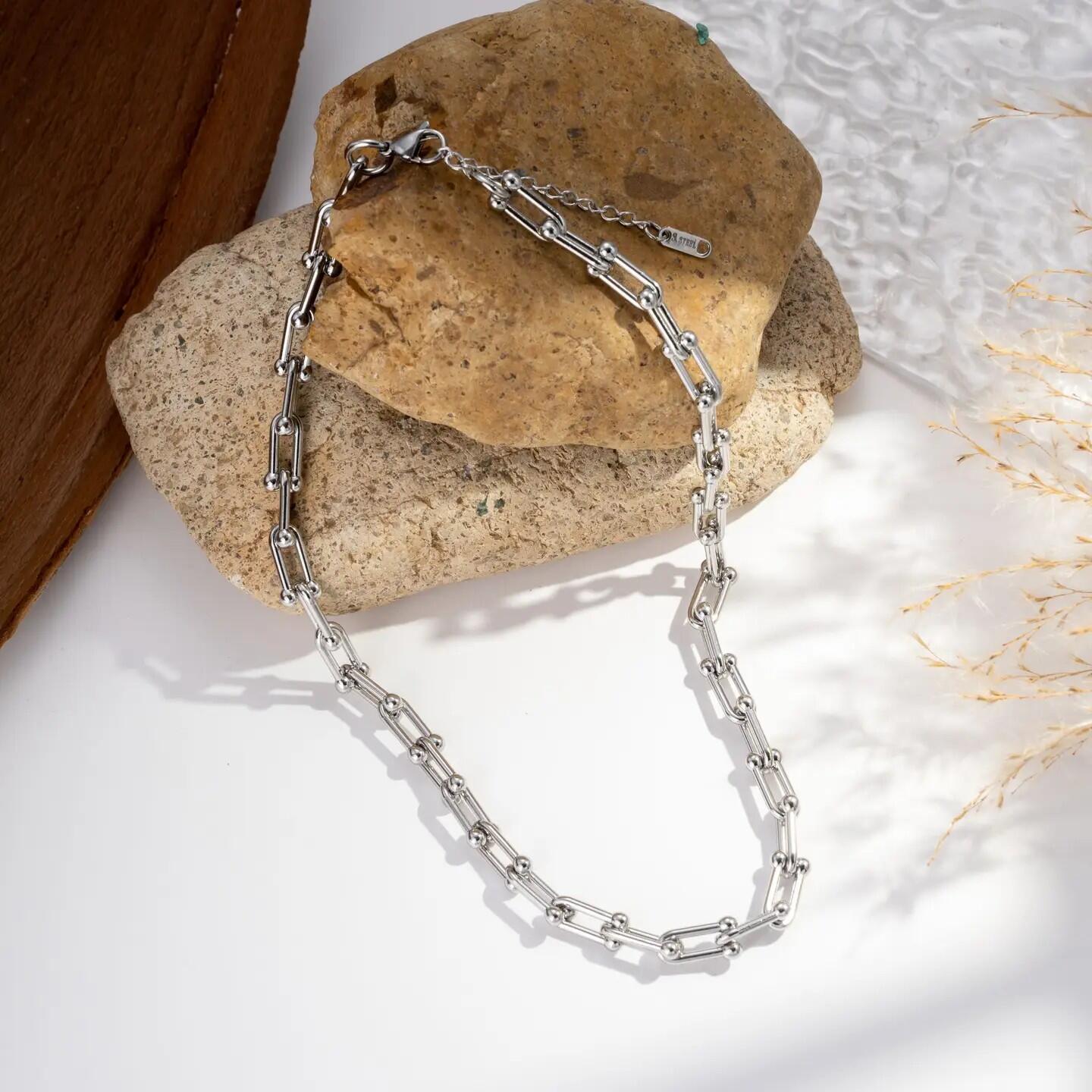 Questa collana a maglia allungata chic e di tendenza è realizzata in acciaio inossidabile durevole, resistente all'acqua e all'uso quotidiano. La sua silhouette moderna, punteggiata da dettagli eleganti, aggiunge un tocco raffinato a tutti gli abiti. Leggera, luminosa e senza tempo In Acciaio Inossidabile, Senza Nichel, senza Cadmio e senza Piombo.