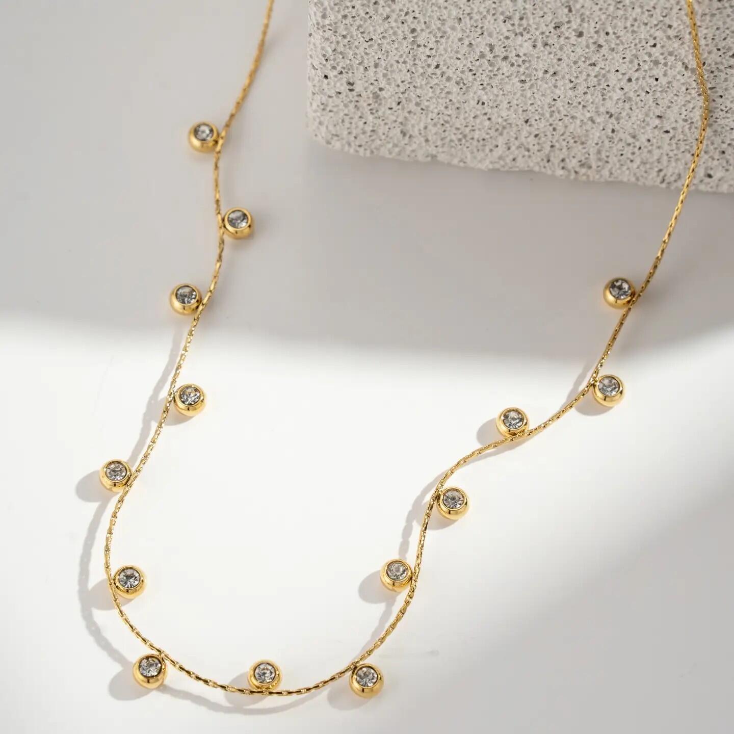 Questa collana dorata in acciaio inossidabile illumina le tue serate con i suoi pendenti incastonati di cristalli chiari. Elegante e raffinata, esalta le scollature con splendore. Resistente all'acqua, ipoallergenica e leggera, si indossa da sola o in accumulo. Gioiello ideale per feste, cocktail o eventi glamour. Un must-have per brillare fino all'alba. In Acciaio Inossidabile, Senza Nichel, senza Cadmio e senza Sale di Piombo.