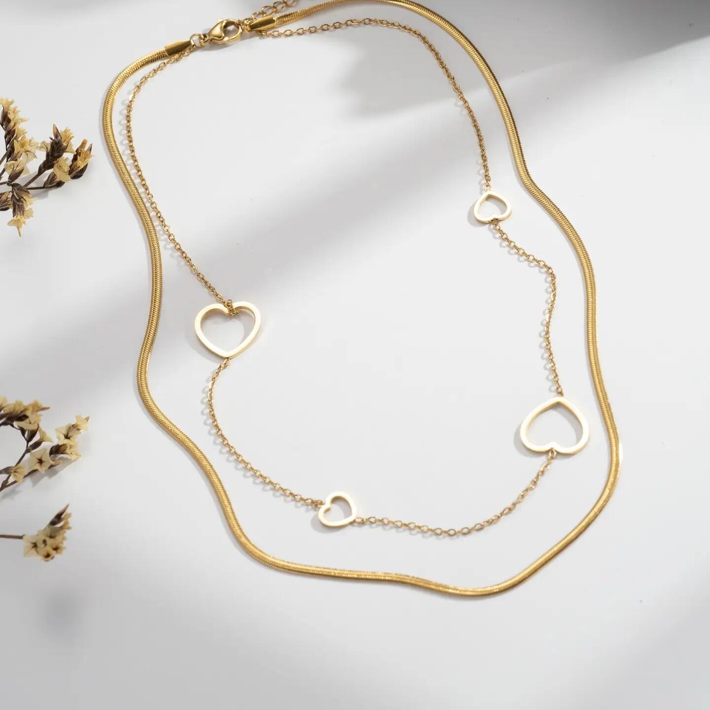 Collana a doppia catena in acciaio inossidabile dorato, ornata da cinque cuori traforati delicati. Questo gioiello femminile incarna l'amore e la dolcezza in un design raffinato. Resistente all'acqua e al tempo, aggiunge un tocco romantico a tutti i tuoi outfit. Perfetto da regalare o da indossare ogni giorno.