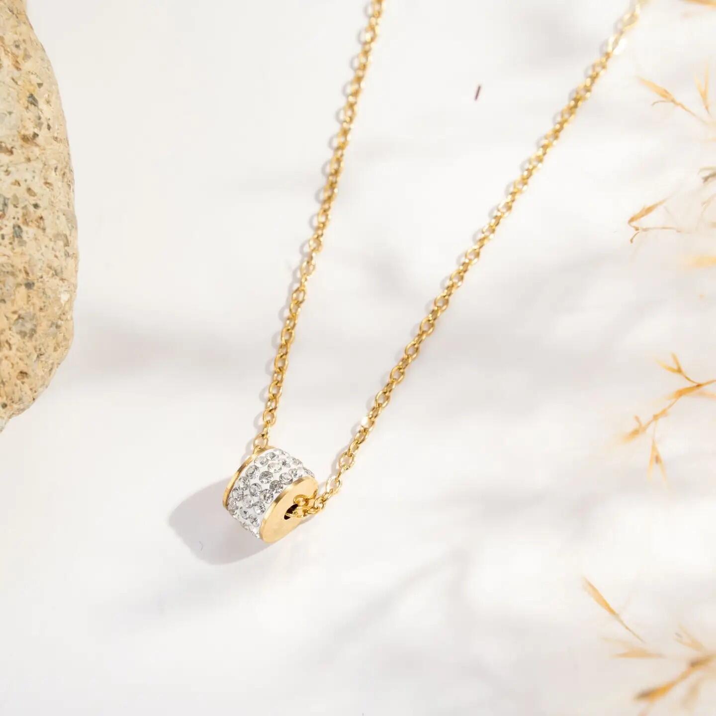 Collana dorata in acciaio inossidabile ornata da un ciondolo cilindrico tempestato di pietre scintillanti. Elegante, resistente e ipoallergenica, aggiunge un tocco luminoso e moderno a ogni outfit. Il suo design minimalista e raffinato lo rende un gioiello senza tempo, perfetto per valorizzare la quotidianità o per fare un regalo chic e di tendenza. In Acciaio Inossidabile, Senza Nichel, senza Cadmio e senza Piombo.
