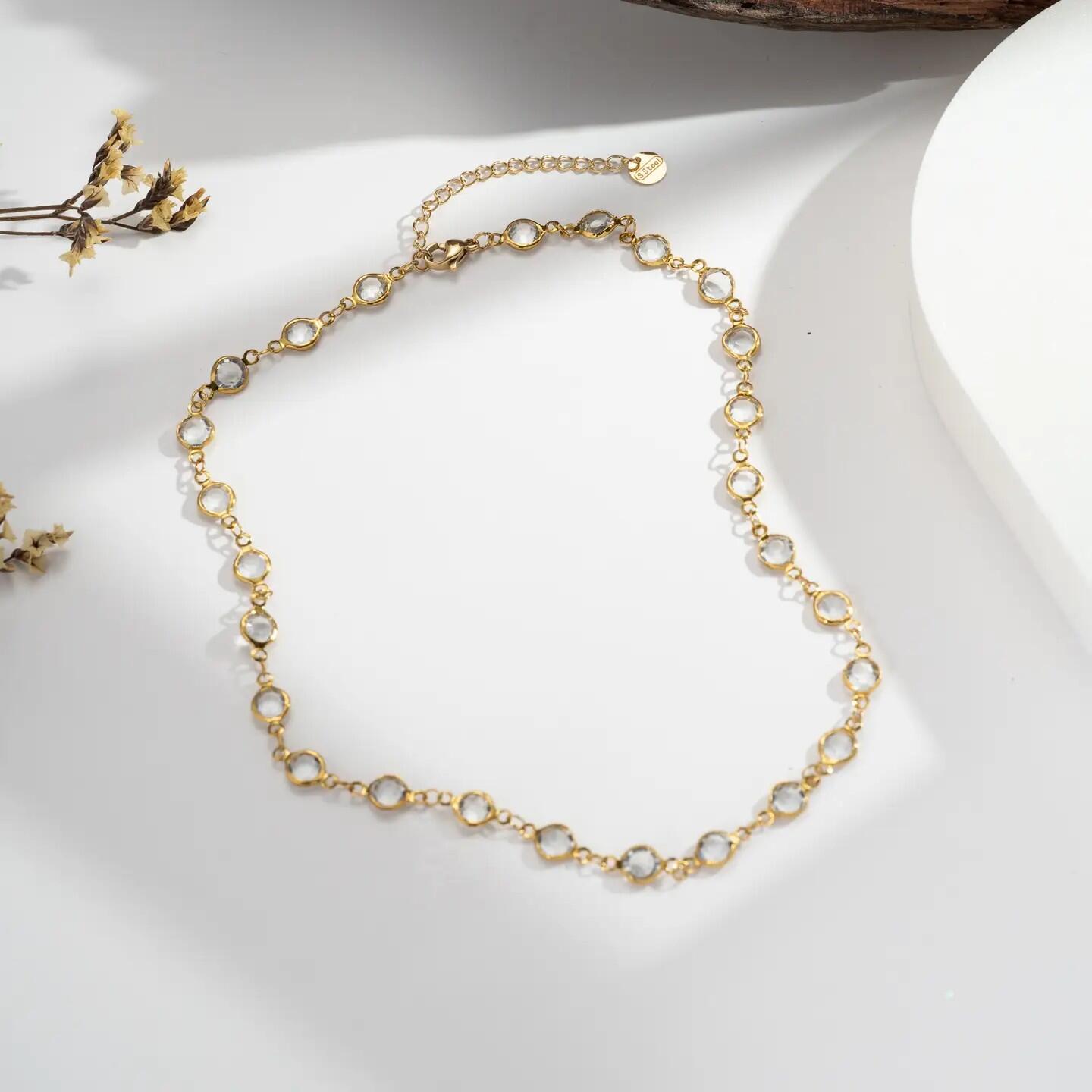 Questa collana in acciaio inossidabile rivela una serie di ciondoli di cristallo rotondi, finemente incastonati e distanziati su una catena delicata. Resistente all'acqua, ipoallergenico e ultra luminoso, cattura ogni raggio per sublimare il collo con grazia. Un gioiello Atelisé da indossare da solo o in accumulo, per un tocco di splendore quotidiano. In Acciaio Inossidabile, Senza Nichel, senza Cadmio e senza Piombo.