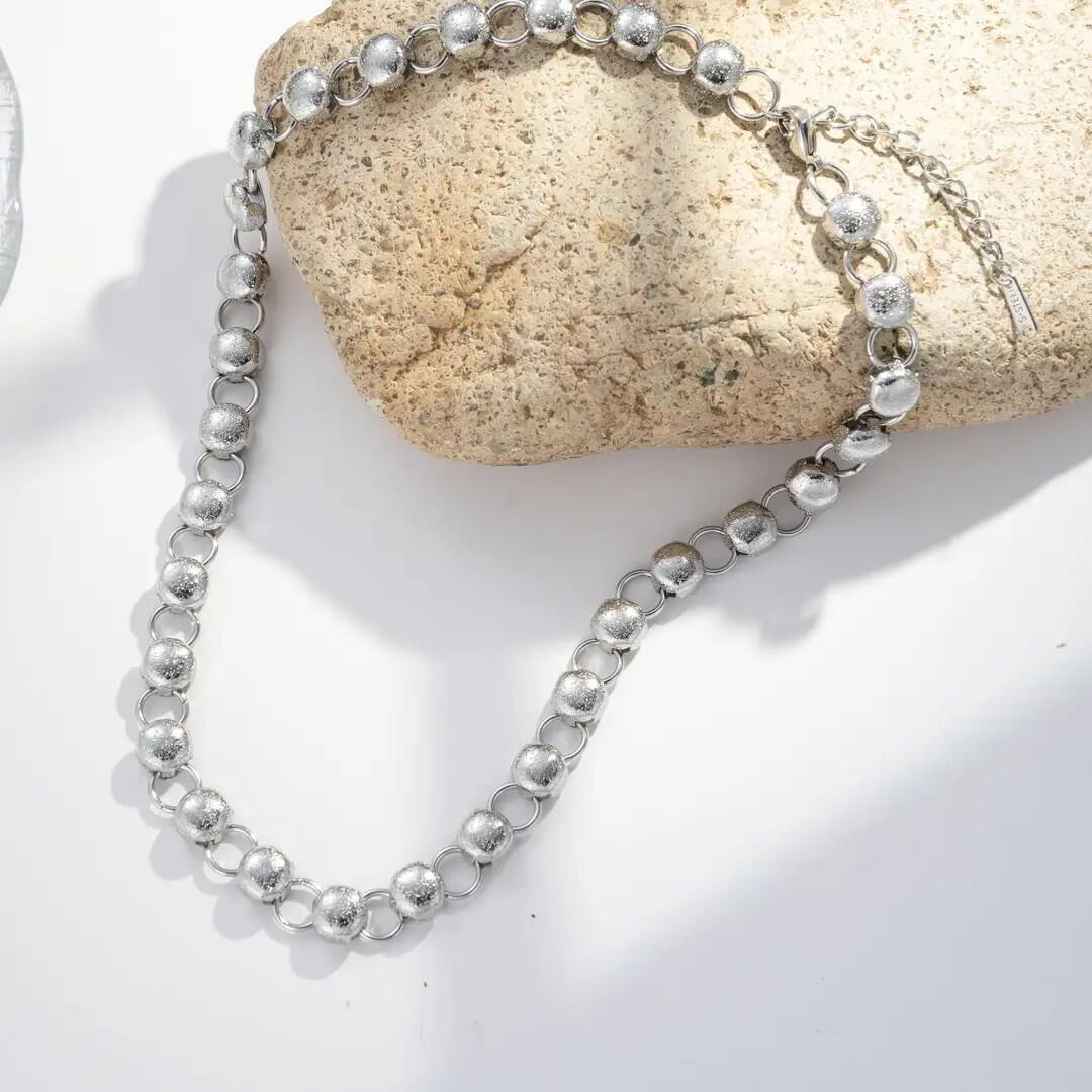 Questa collana argentata in acciaio inossidabile affascina con la sua sequenza di sfere brillanti e maglie rotonde, per un effetto luminoso e minimalista. La sua finitura a specchio cattura la luce con eleganza, mentre la sua catena regolabile assicura un comfort perfetto. Ipoallergenica e resistente all'acqua, si adatta a tutti gli stili: chic, urbano o casual. Un gioiello senza tempo, sia grafico che raffinato, ideale per sublimare un abbigliamento con discrezione. In Acciaio Inossidabile, Senza Nichel, senza Cadmio e senza Piombo.