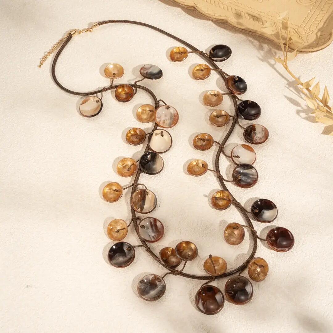 Questa collana boho-chic in resina marmorizzata evoca i rami di un sottobosco mistico. Le sue perle nei toni del marrone e del nero si intrecciano su un cordone ramificato, creando una silhouette organica e artistica. Gioiello fantasia ideale per gli spiriti liberi, sublima gli abiti naturali con eleganza e carattere.
