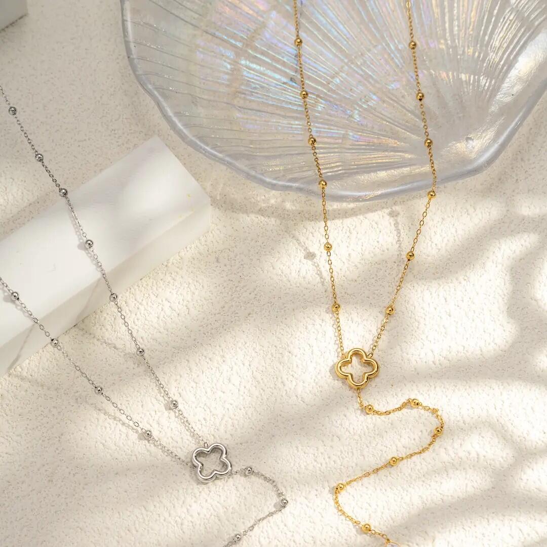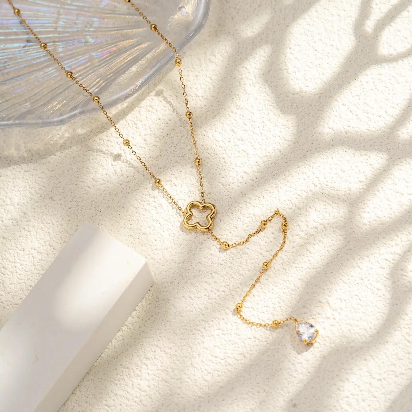 Questa collana dorata presenta una catena sottile ornata da piccole perle metalliche e da un ciondolo quadrifoglio traforato, simbolo di fortuna e dolcezza. Una goccia cristallina sospesa aggiunge un tocco luminoso ed elegante. Fina, femminile e senza tempo, si indossa quotidianamente così come per occasioni più eleganti. Un pezzo delicato e raffinatoIn Acciaio Inossidabile, Senza Nichel, senza Cadmio e senza sali di Piombo