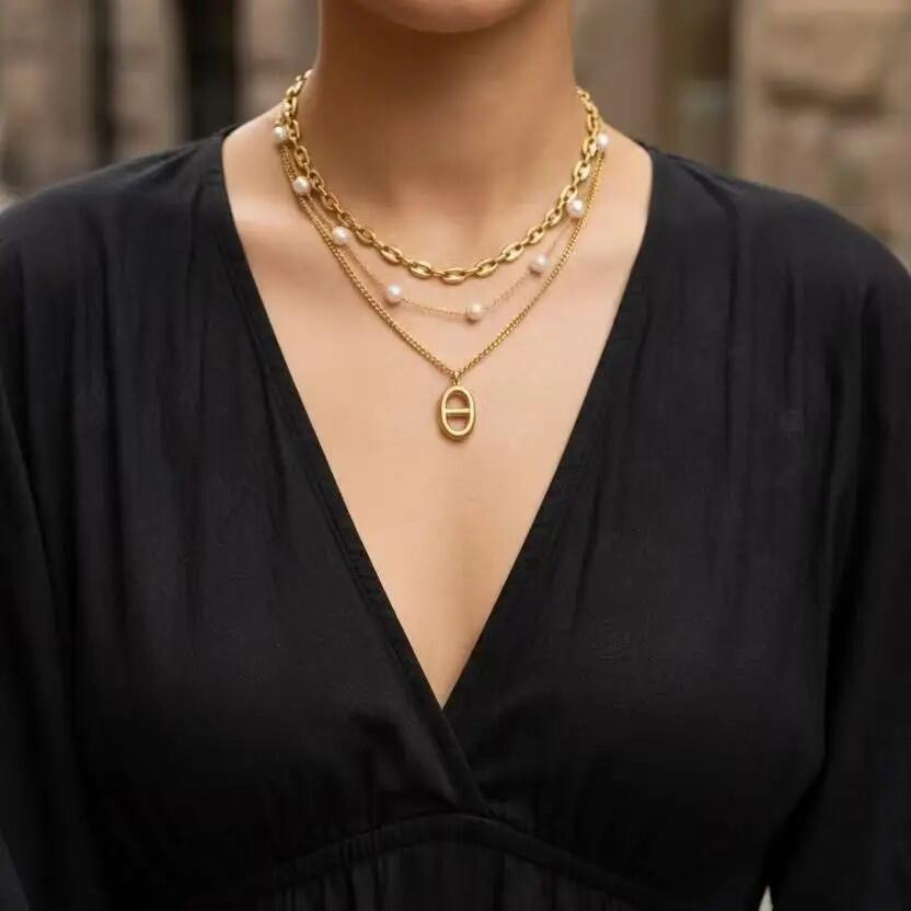 Questa collana a triplo filo in acciaio inossidabile dorato combina armoniosamente perle delicate, maglie eleganti e un pendente minimalista per un risultato raffinato e moderno. Resistente all'acqua e durevole, mantiene la sua lucentezza quotidianamente. La sua sovrapposizione perfettamente bilanciata aggiunge un tocco luminoso e femminile, ideale per esaltare un abbigliamento semplice o completare un look più sofisticato. Leggera, confortevole e alla moda, questa collana multi-filo diventa un pezzo imprescindibile per uno stile chic e senza tempo.