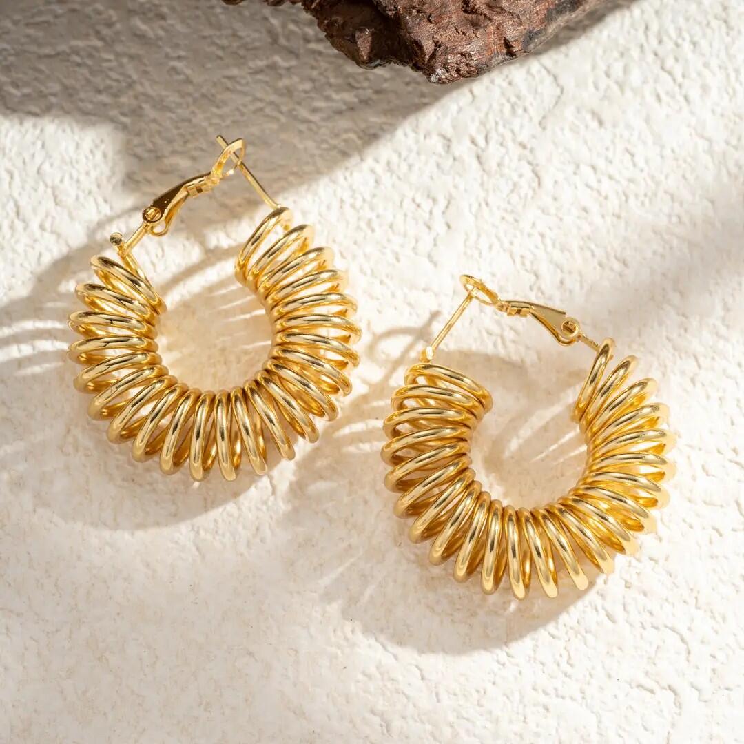 Questi orecchini a cerchio dorati in acciaio inossidabile adottano una forma a spirale generosa e testurizzata. Il loro design scultoreo e la finitura brillante offrono un aspetto audace ed elegante. Ipoallergenici e durevoli, esaltano i tuoi abiti con carattere. Un gioiello luminoso e deciso, perfetto per chi ama gli accessori originali e moderni. In Acciaio Inossidabile, Senza Nichel, senza Cadmio e senza Piombo.