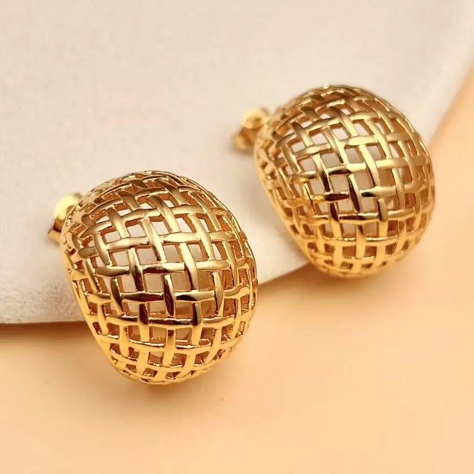 Questi orecchini dal design intrecciato dorato catturano con la loro struttura traforata e il loro splendore luminoso. Ispirati all'arte della tessitura, offrono un aspetto contemporaneo e sofisticato. Leggeri ma imponenti, valorizzano qualsiasi abbigliamento con un tocco architettonico chic.