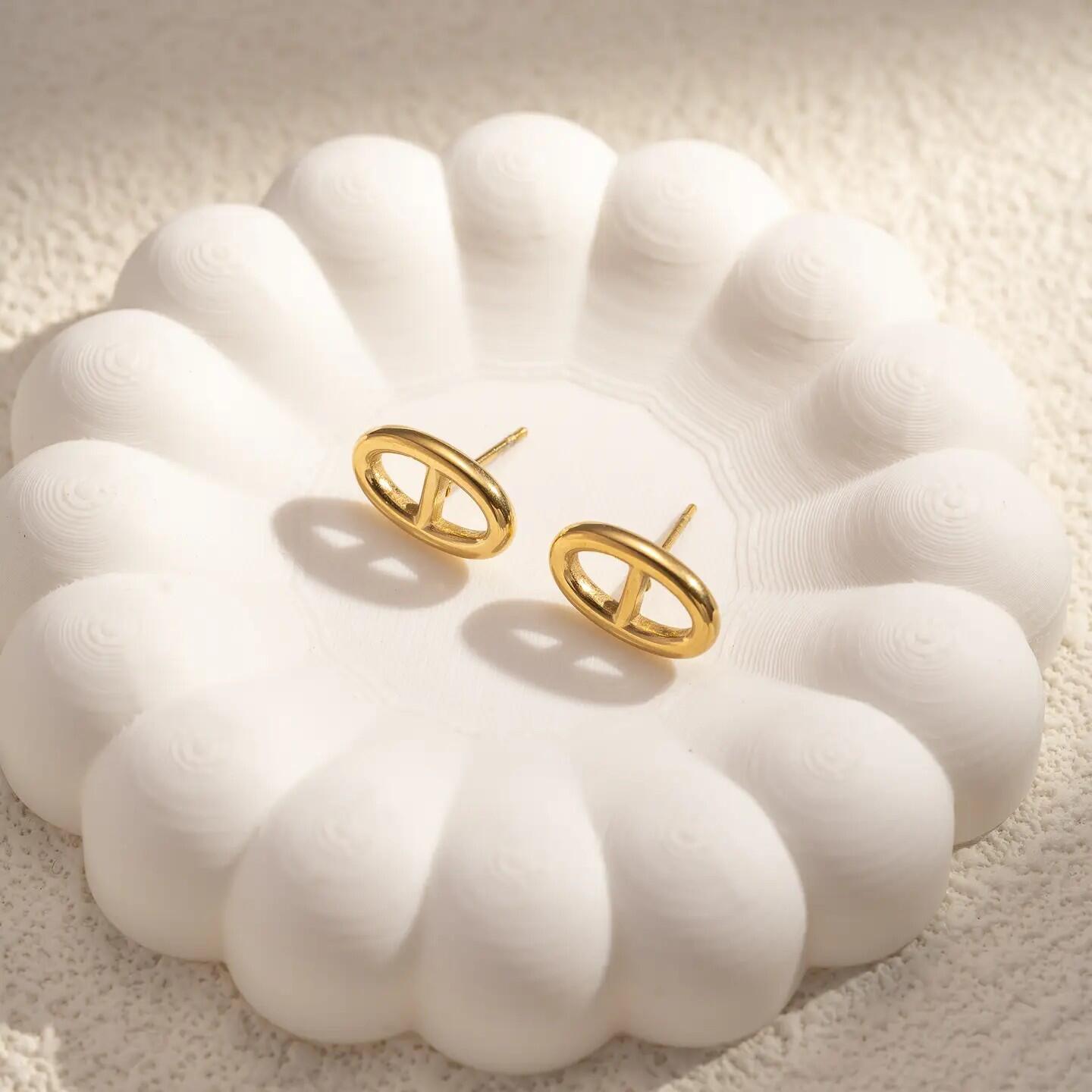 Questi orecchini in acciaio inossidabile dorato presentano un motivo ovale elegante in stile minimalista. Leggeri e ipoallergenici, si indossano facilmente sia quotidianamente che in serata. La loro finitura brillante e il design essenziale li rendono un gioiello senza tempo, perfetto per esaltare il tuo look con discrezione e modernità.