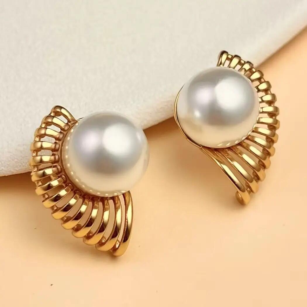 Questi eleganti orecchini abbinano una perla centrale madreperlata a una struttura dorata a ventaglio scolpito. Il loro design sofisticato evoca il lusso senza tempo e la femminilità. Perfetti per le grandi occasioni o per valorizzare un abbigliamento quotidiano con un tocco di prestigio e luce.