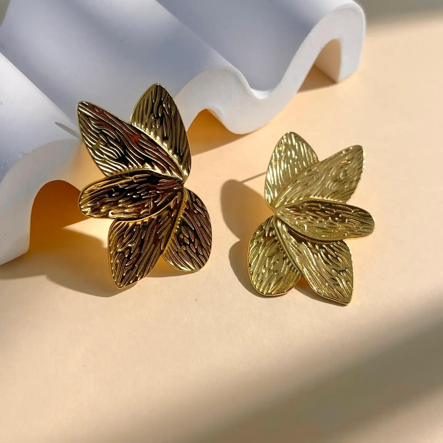Orecchini a forma di petali sovrapposti, in acciaio inossidabile. Texture cesellata per un effetto naturale e raffinato.