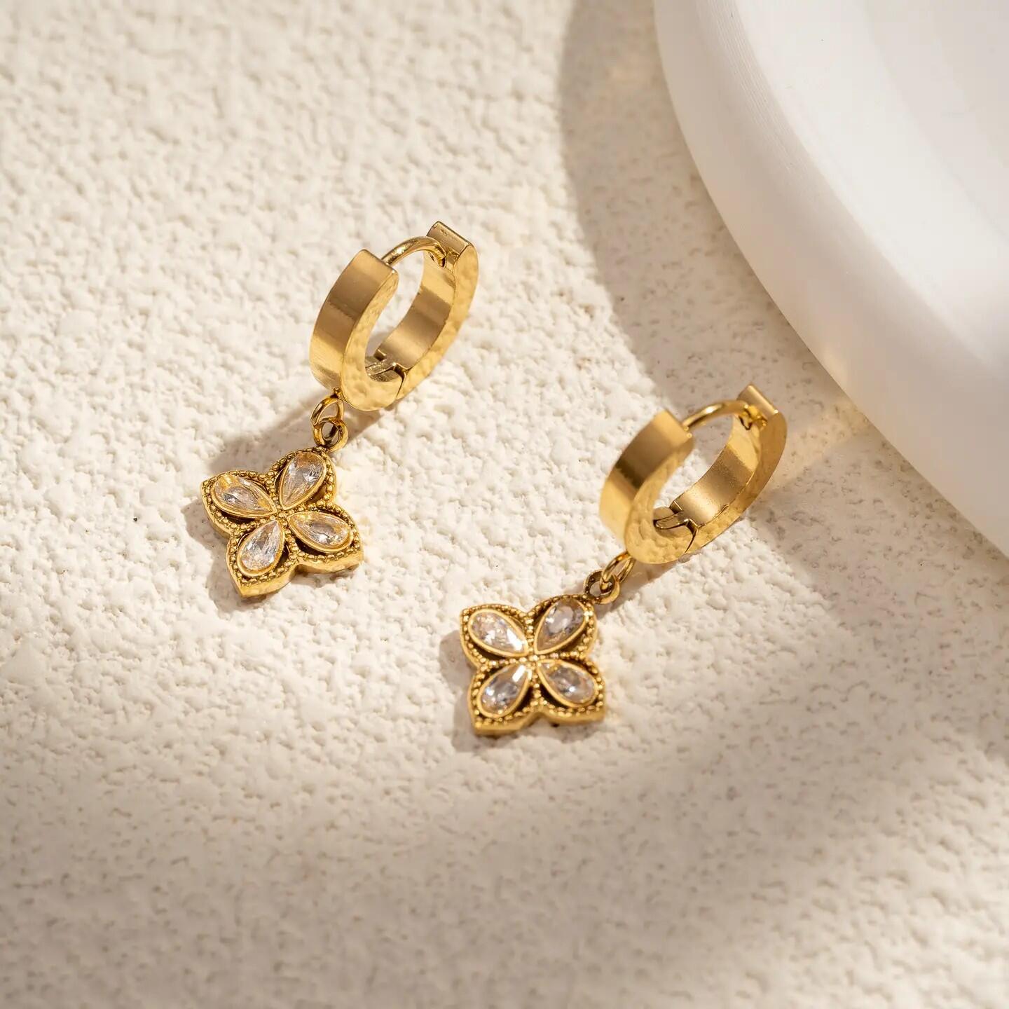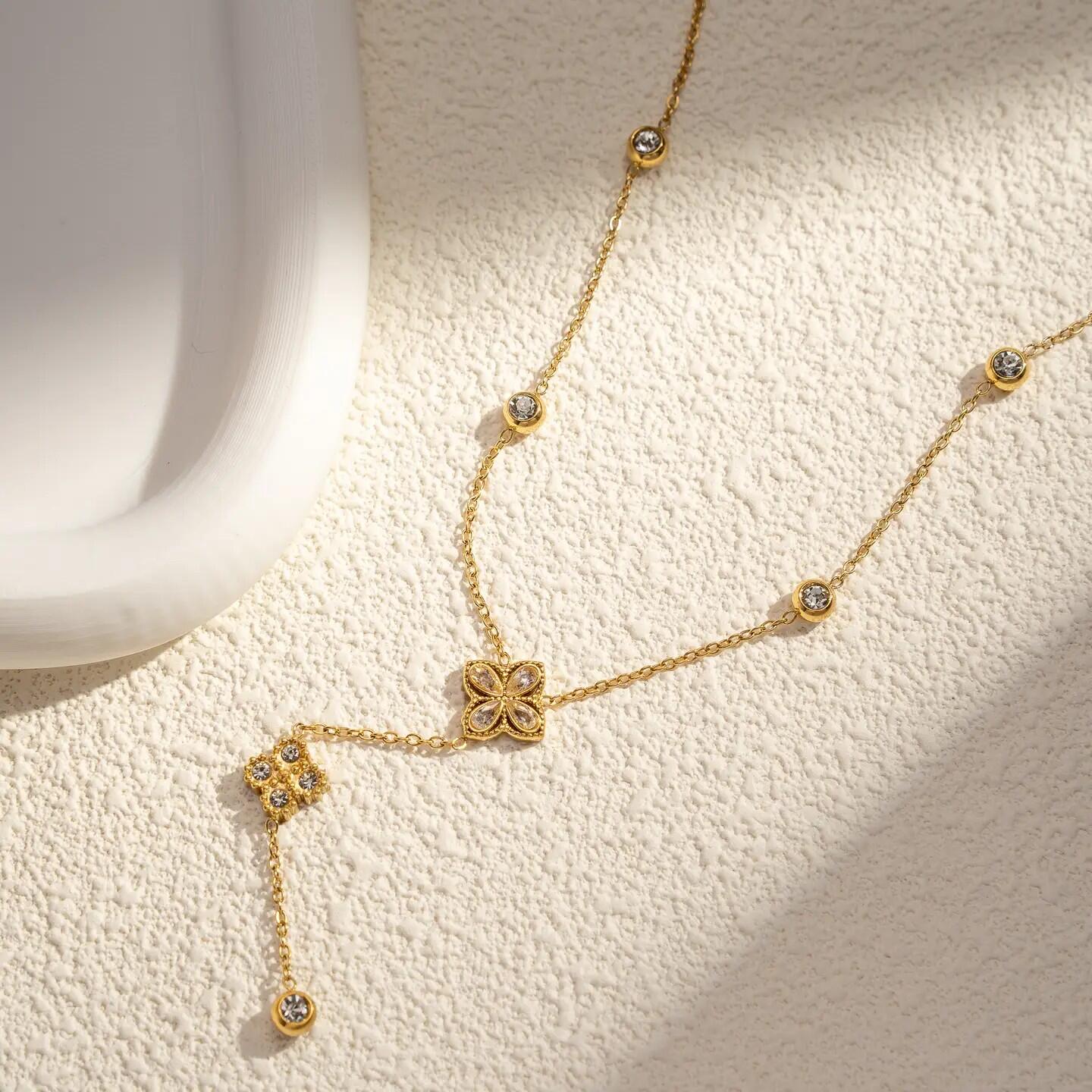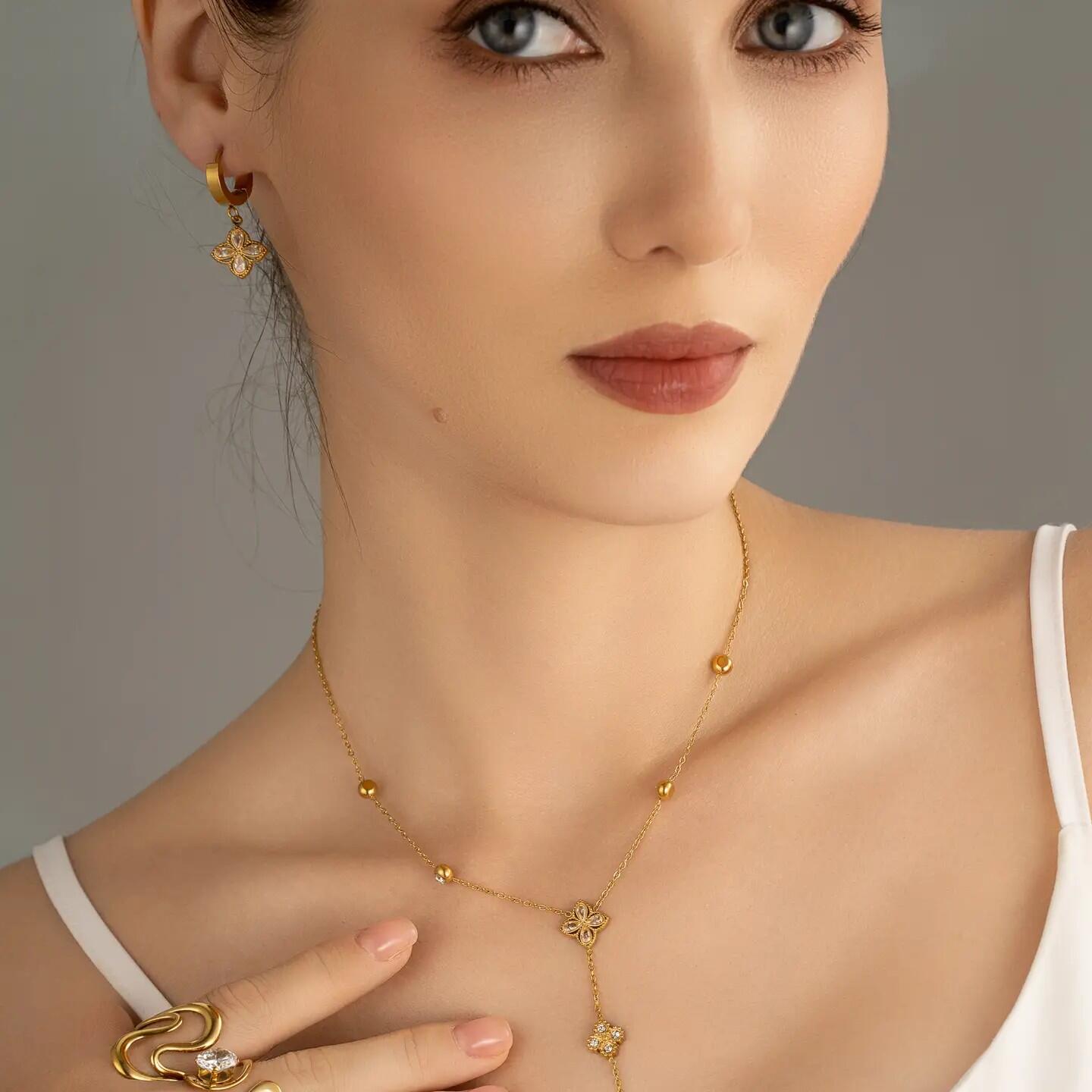Questo raffinato set in acciaio inox dorato comprende una collana e orecchini coordinati, decorati con un ciondolo a forma di quadrifoglio scintillante impreziosito da cristalli. Simbolo di fortuna ed eleganza, illumina il viso con brillantezza. Resistente all’acqua e durevole, è un’idea regalo perfetta per chi desidera un gioiello chic e carico di significato.