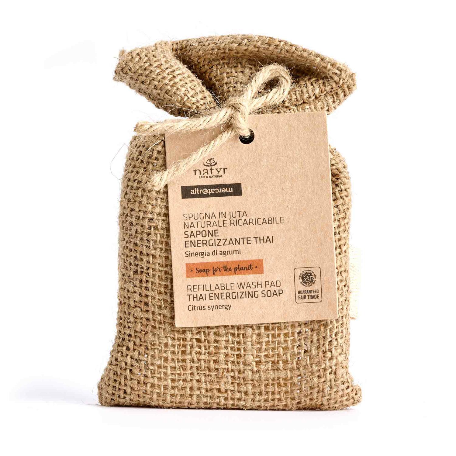 Una spugna in juta naturale per detergere la pelle in modo delicato e sostenibile. Realizzata artigianalmente in Thailandia, ha all’interno un sapone a base di olio di cocco e una miscela di oli essenziali dall’azione energizzante. La chiusura a coulisse permette di ricaricare la spugna o di recuperare piccoli pezzi di sapone per consumarli in modo pratico senza spreco.