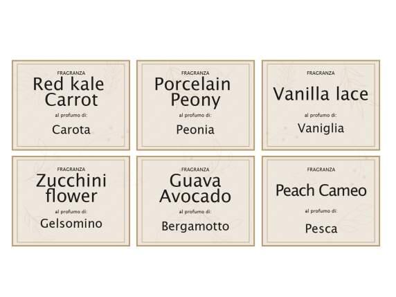 Fragranze: Red Kale Carrot, Porcelain Peony, Vanilla Lace, Zucchini Flower, Guava Avocado, Peach Cameo