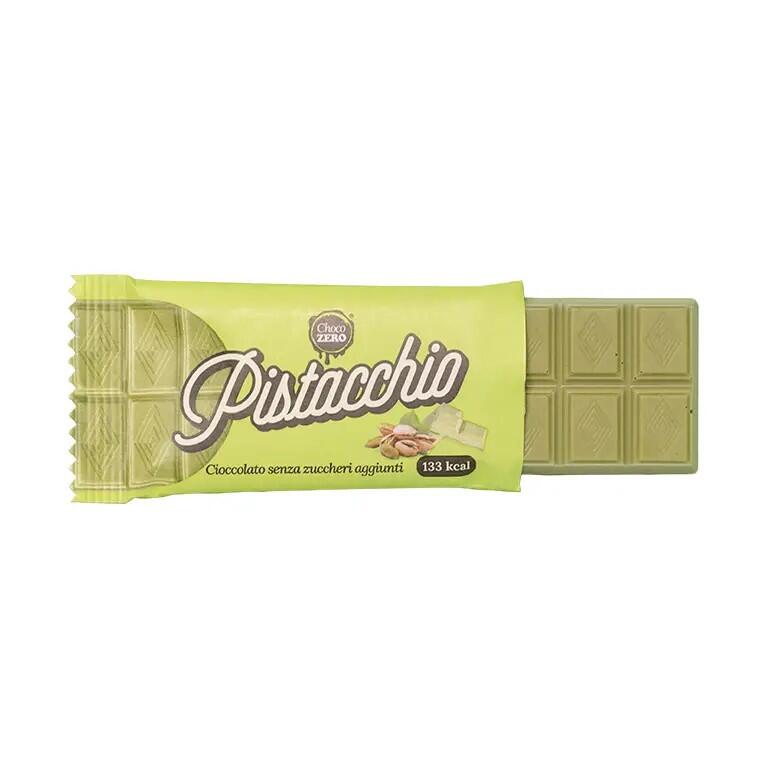 Ingredienti: cioccolato bianco con edulcorante (min. 83%), edulcorante (maltitolo), burro di cacao (min.30,6%), latte intero in polvere; emulsionante (lecitina di soia); aroma naturale di vaniglia, pasta pistacchio (min. 17%), sale.