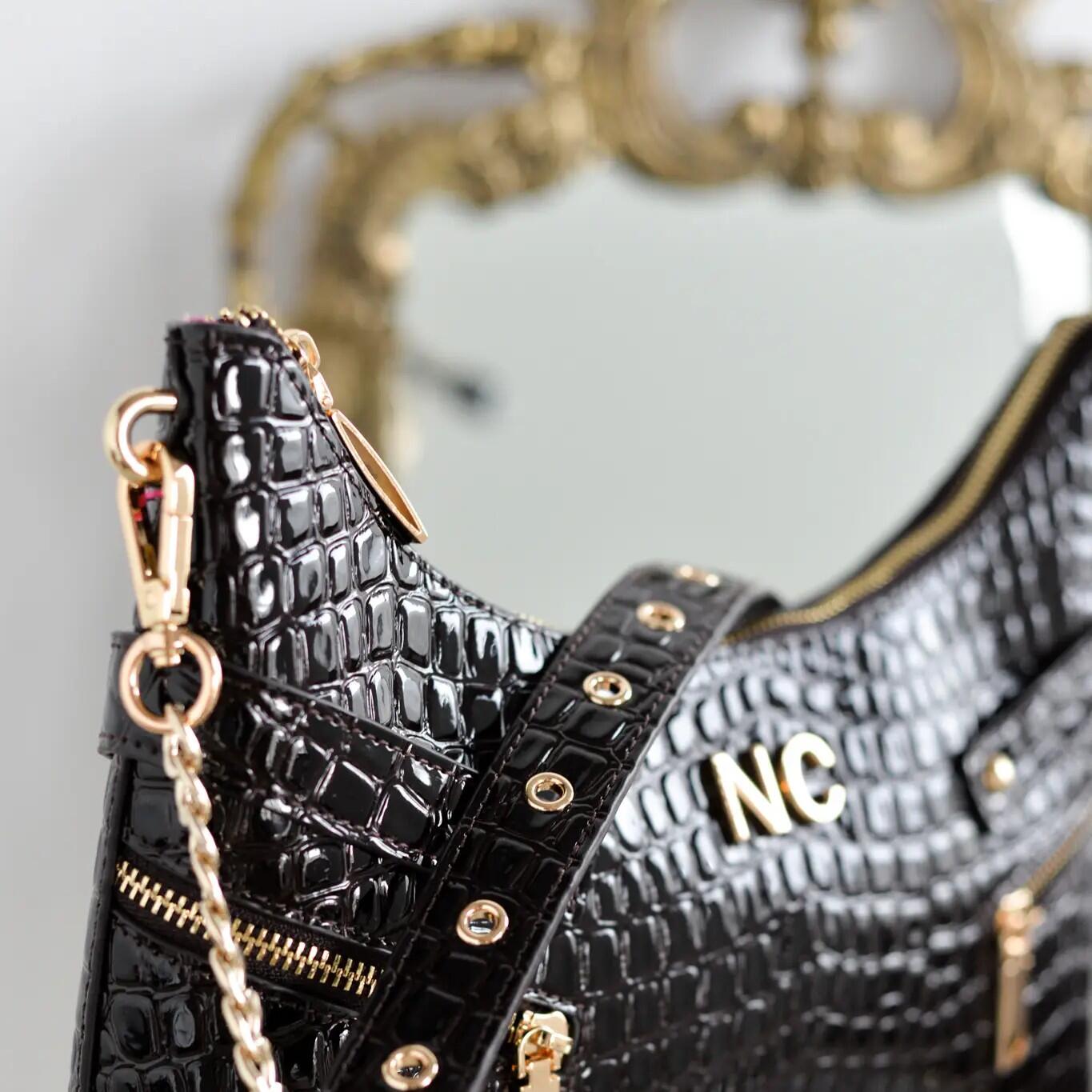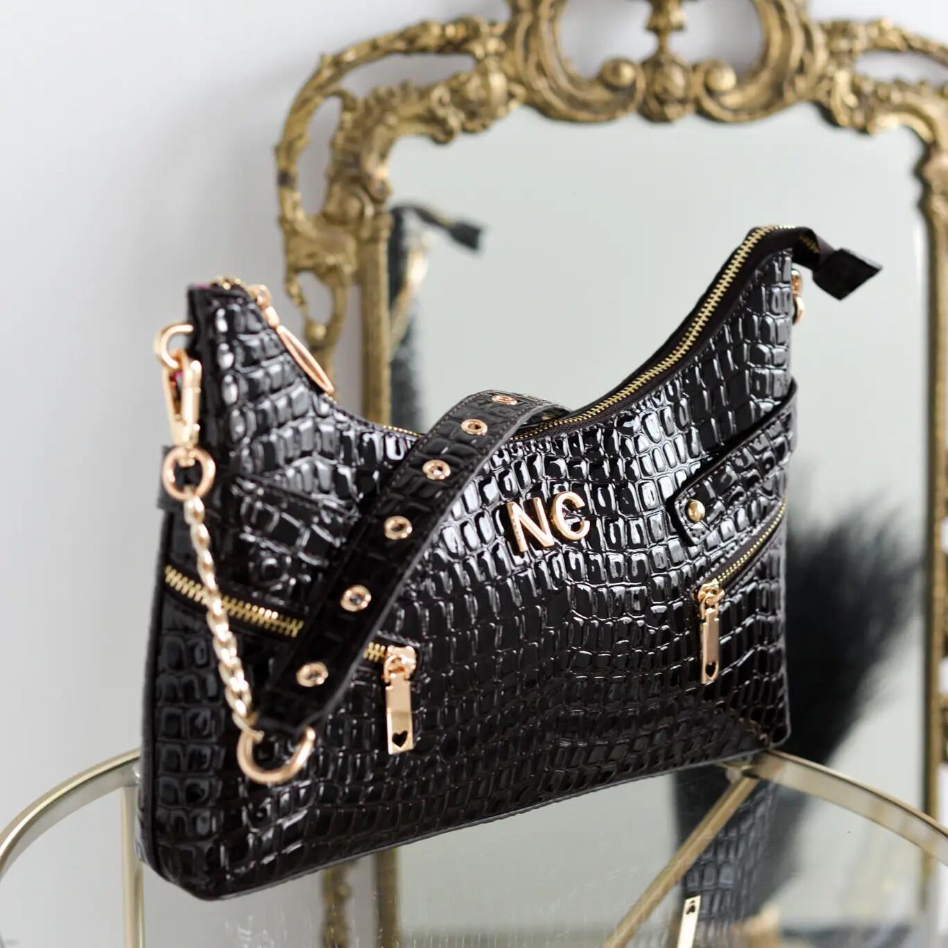 Questa borsa tipo baguette si distingue per il suo design sottile ed elegante, realizzata in vernice con texture di coccodrillo per un risultato sofisticato e strutturato. La sua catena corta dorata permette di portarla comodamente a spalla, mentre il dettaglio in vernice nella zona della spalla aggiunge comfort e un tocco di lusso. Perfetta per chi cerca un accessorio elegante e discreto che faccia la differenza in ogni occasione.Caratteristiche principali:- Catena corta dorata per portare a spalla- Dettaglio in vernice per maggiore comfort sulla spallaIl complemento ideale per un look raffinato e moderno.