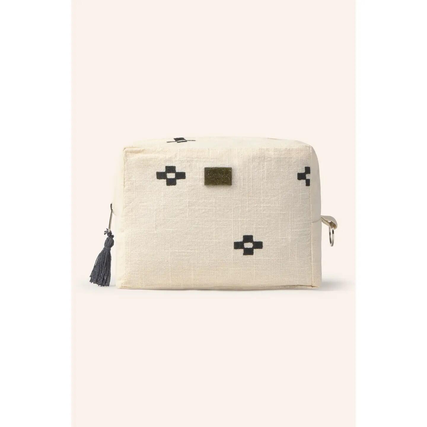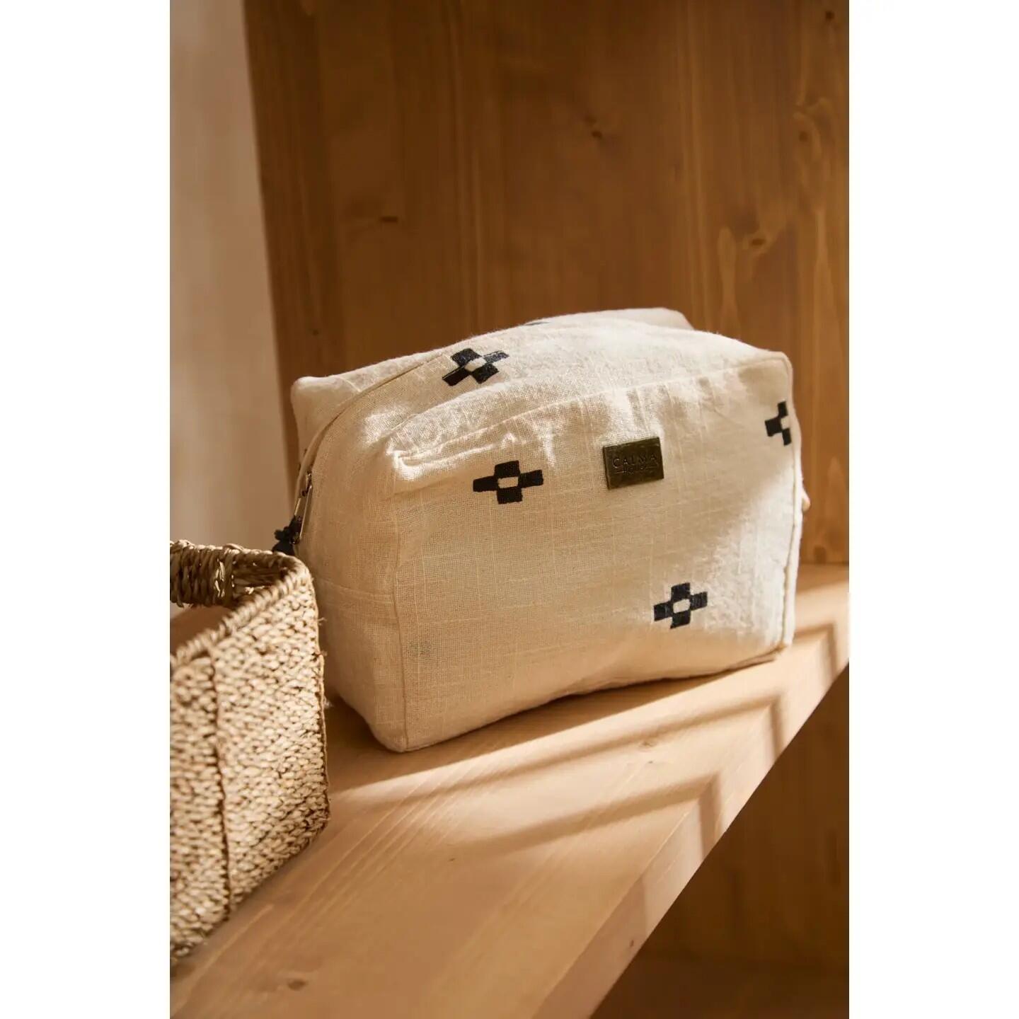 Necessaire in cotone vintage grezzo con stampa geometrica. Fodera interna impermeabile. Chiusura con zip e dettaglio con pompon. Anello laterale per presa.