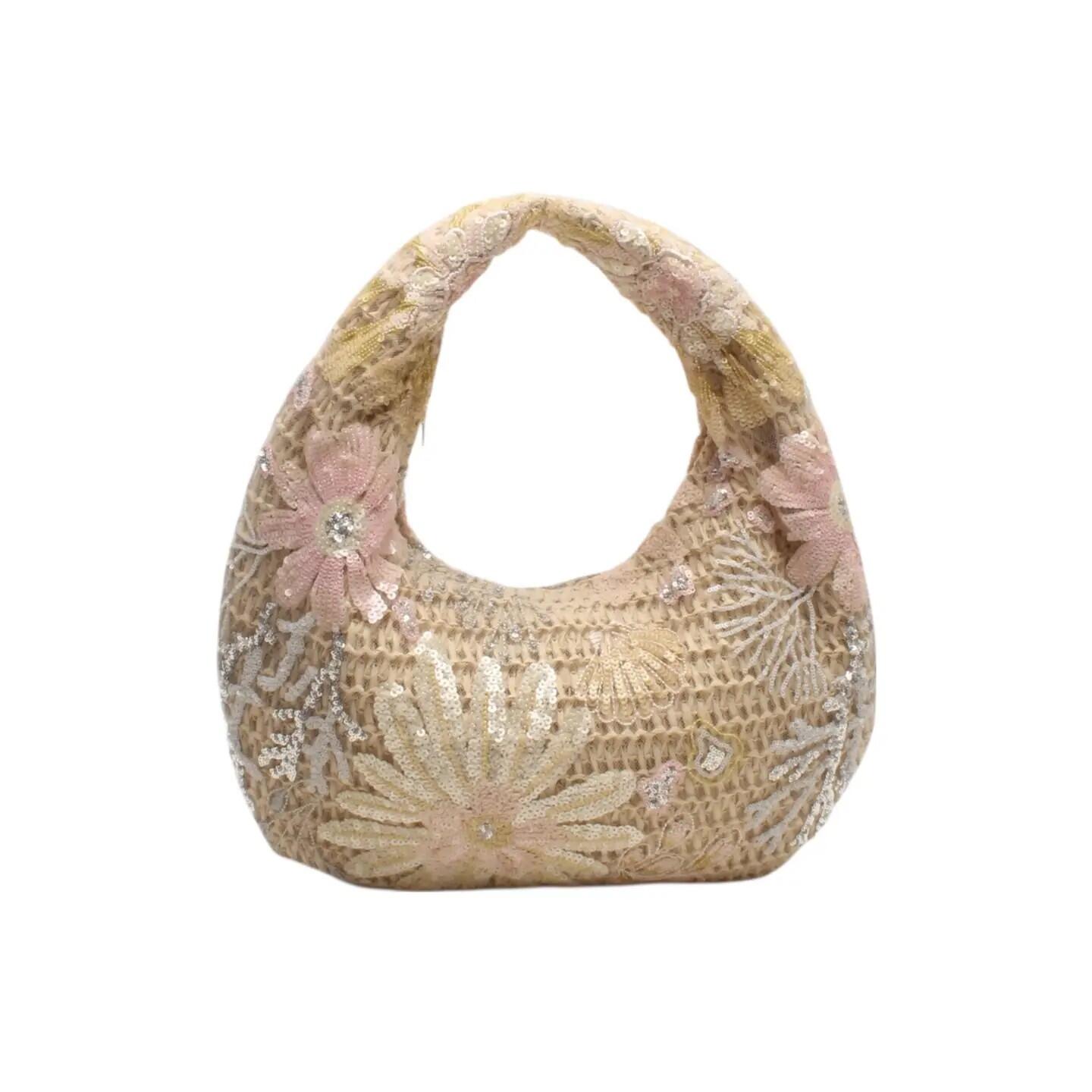 Borsa a spalla, in tela, intrecciata, effetto fiore, con zip