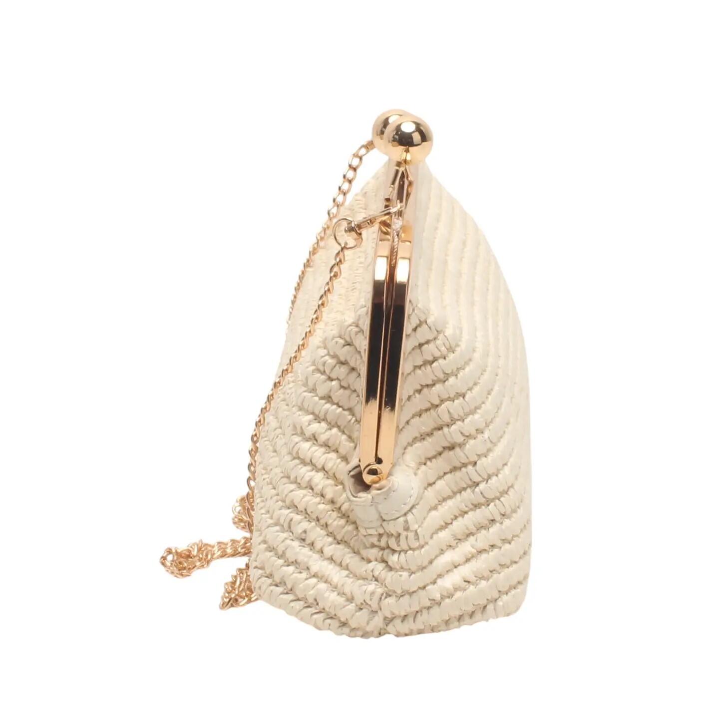 Borsa pochette con tracolla a catena, clic clac, effetto paglia