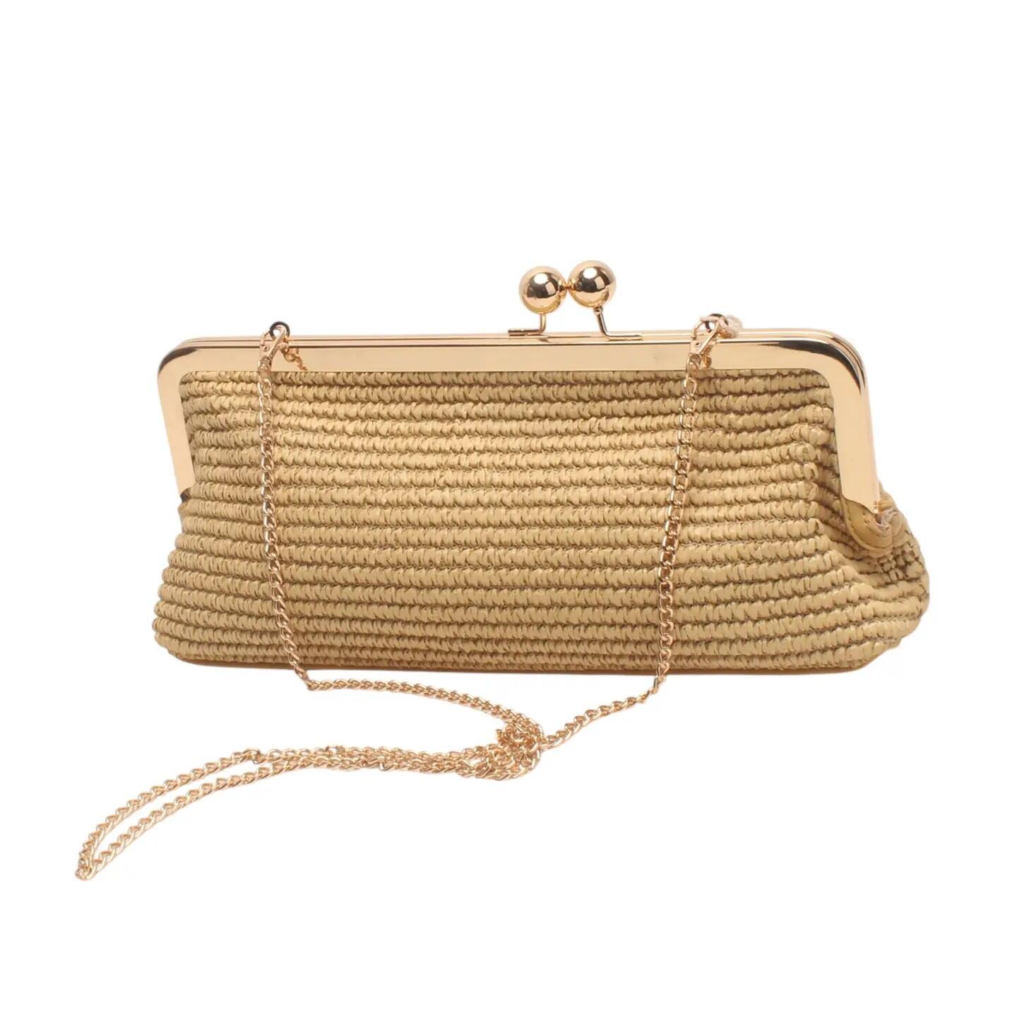 Borsa pochette con tracolla a catena, clic clac, effetto paglia