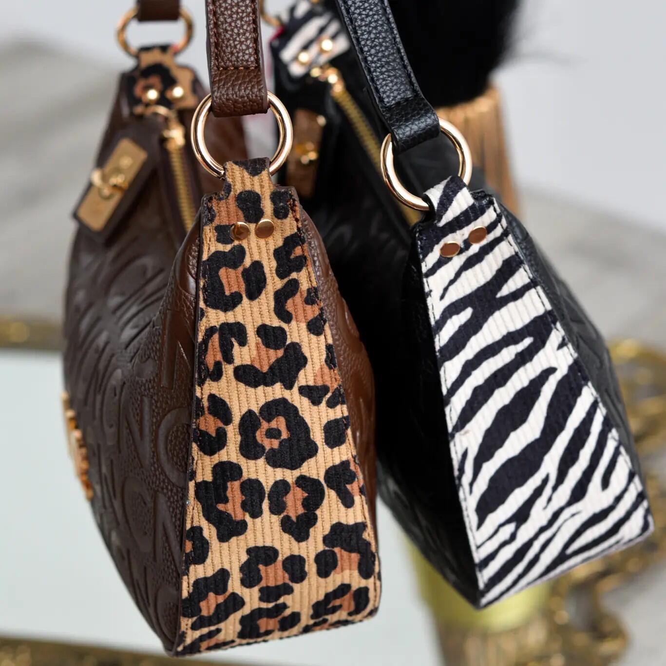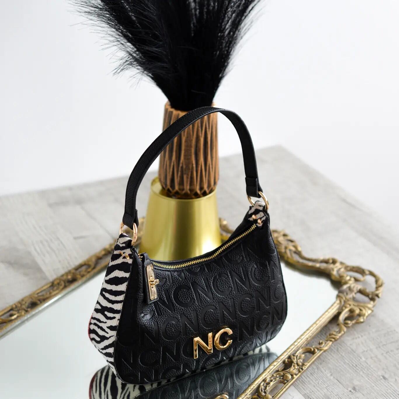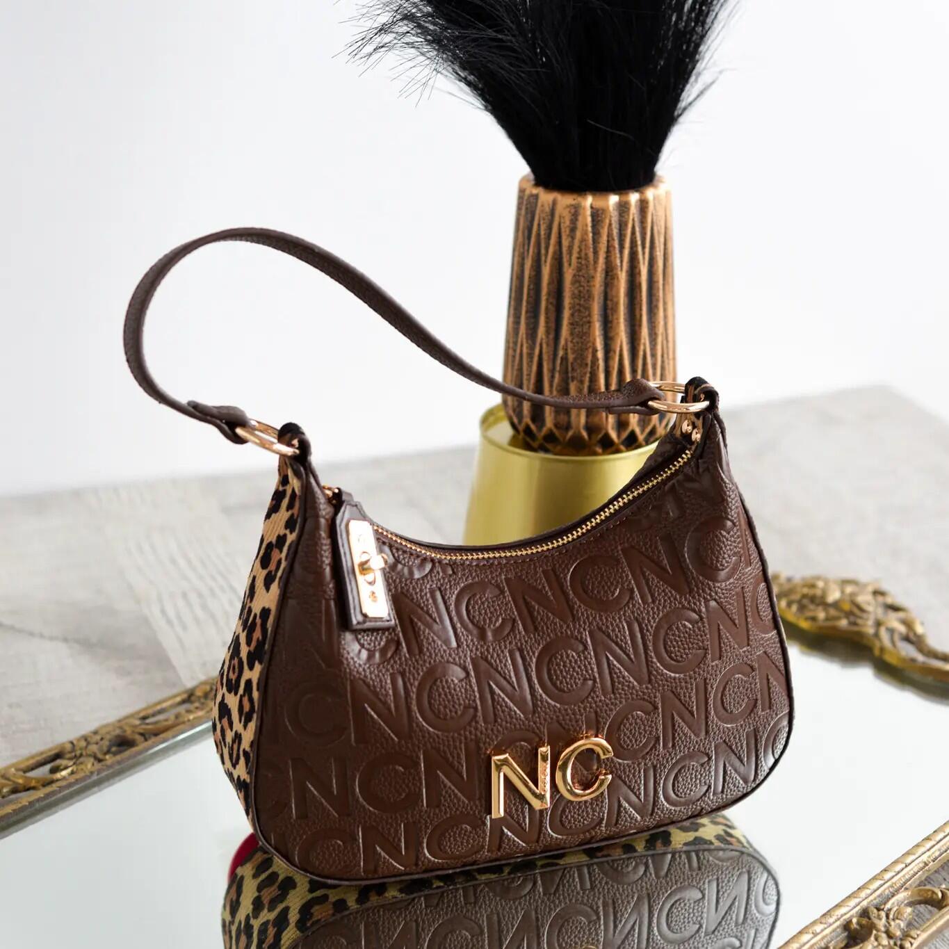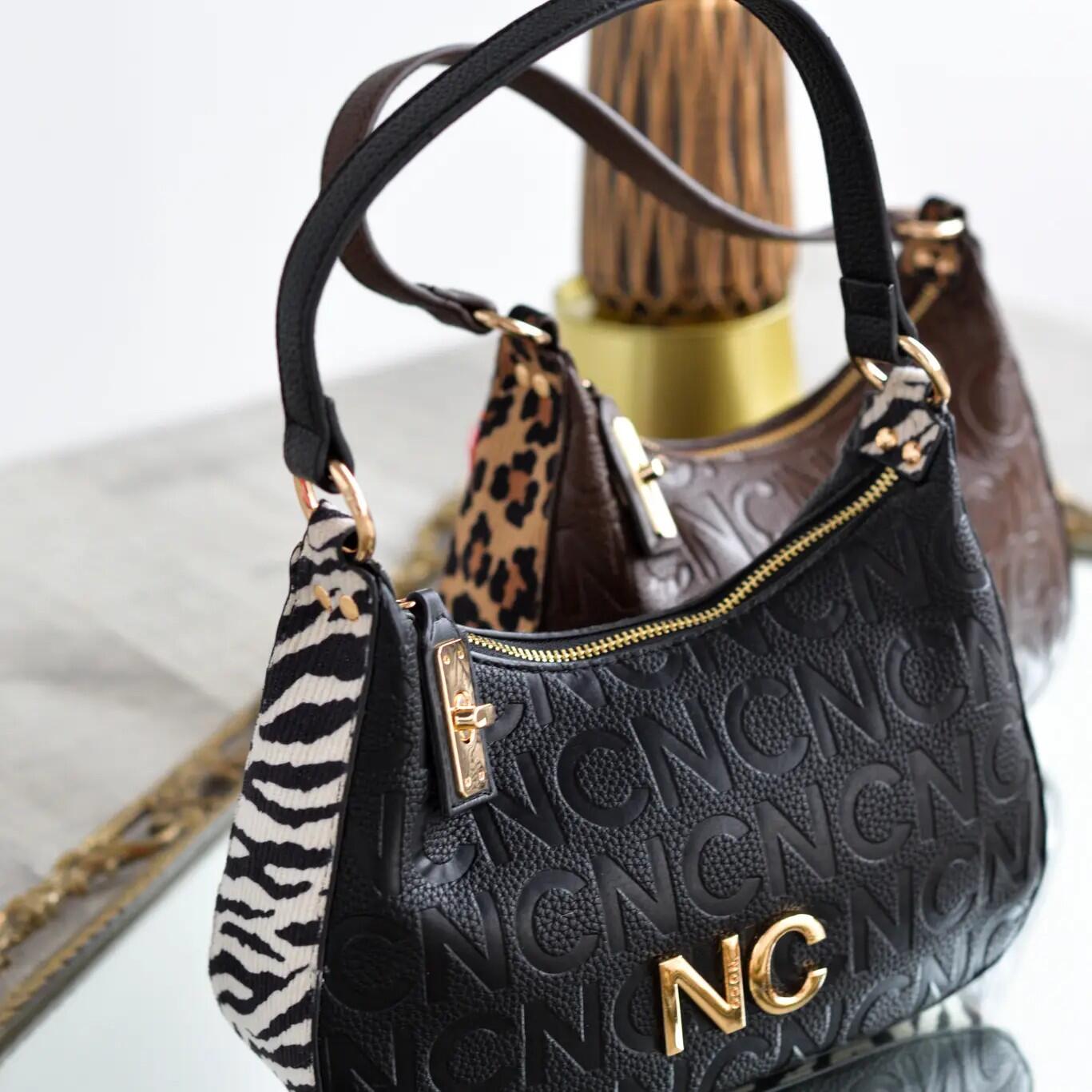 La piccola borsa gondola combina la pelle sintetica incisa con le iniziali NC sul corpo principale, con i lati in velluto a coste con stampa animalier che conferiscono un tocco di contrasto e uno stile unico.