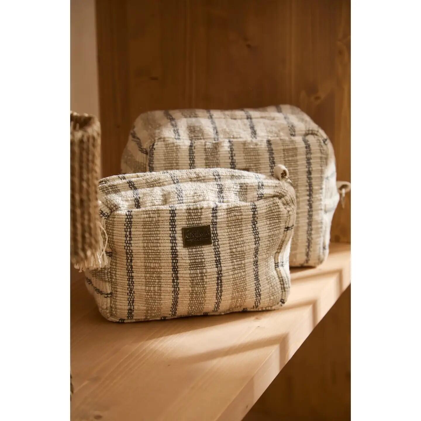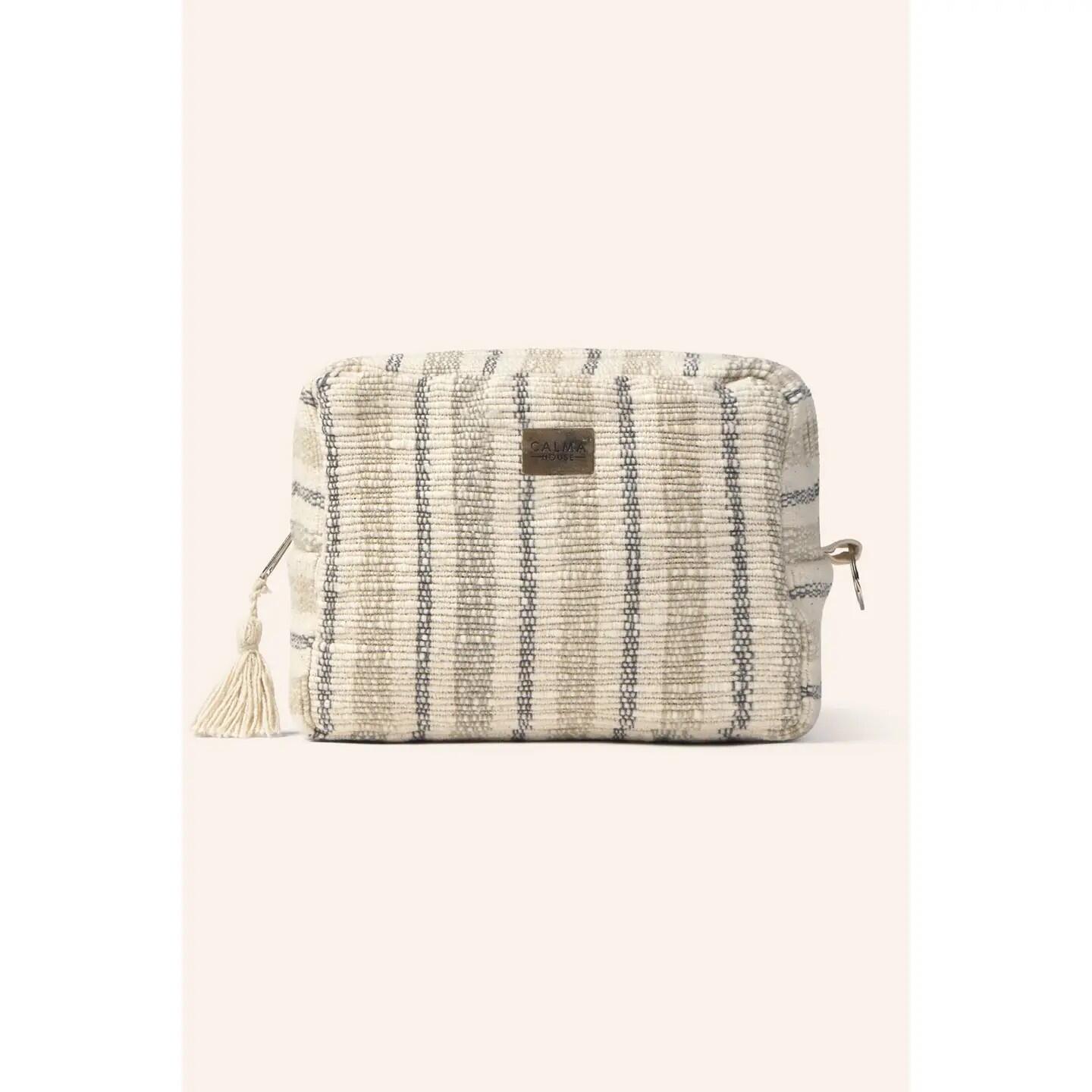 Necessaire in cotone ad alta grammatura. Fodera interna. Chiusura con zip e dettaglio pompon. Interno resistente all’acqua. Anello laterale per impugnatura.
