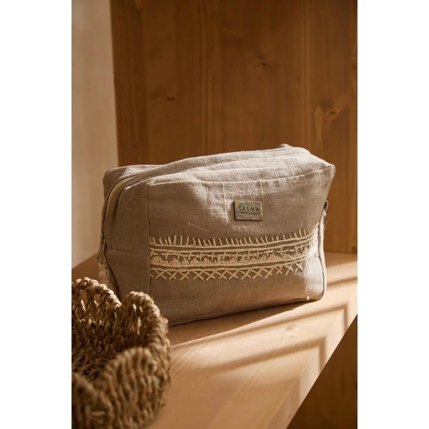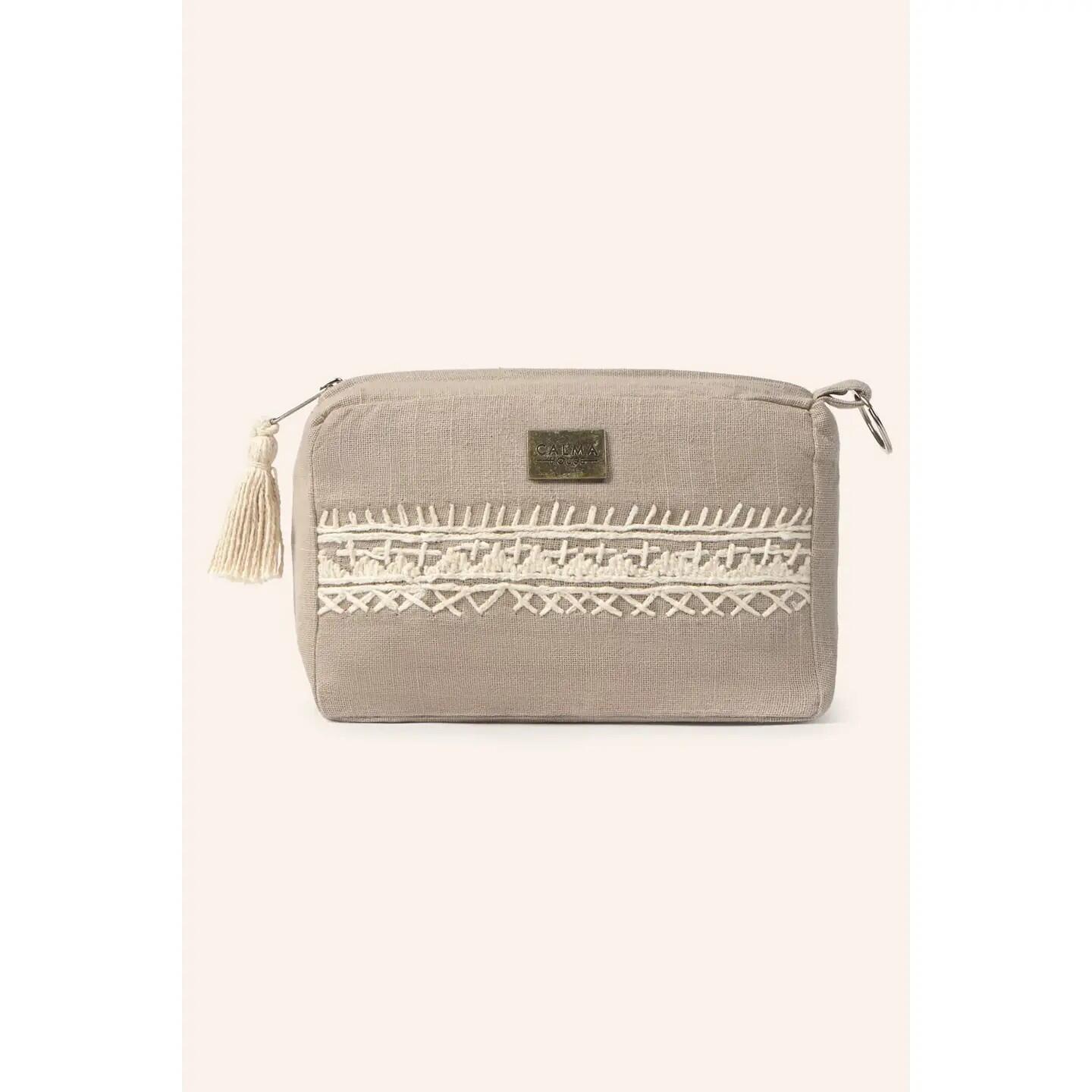 Necessaire in cotone color pietra con ricamo naturale. Chiusura con cerniera e dettaglio pon-pon. Interno resistente all'acqua. Anello laterale per presa.