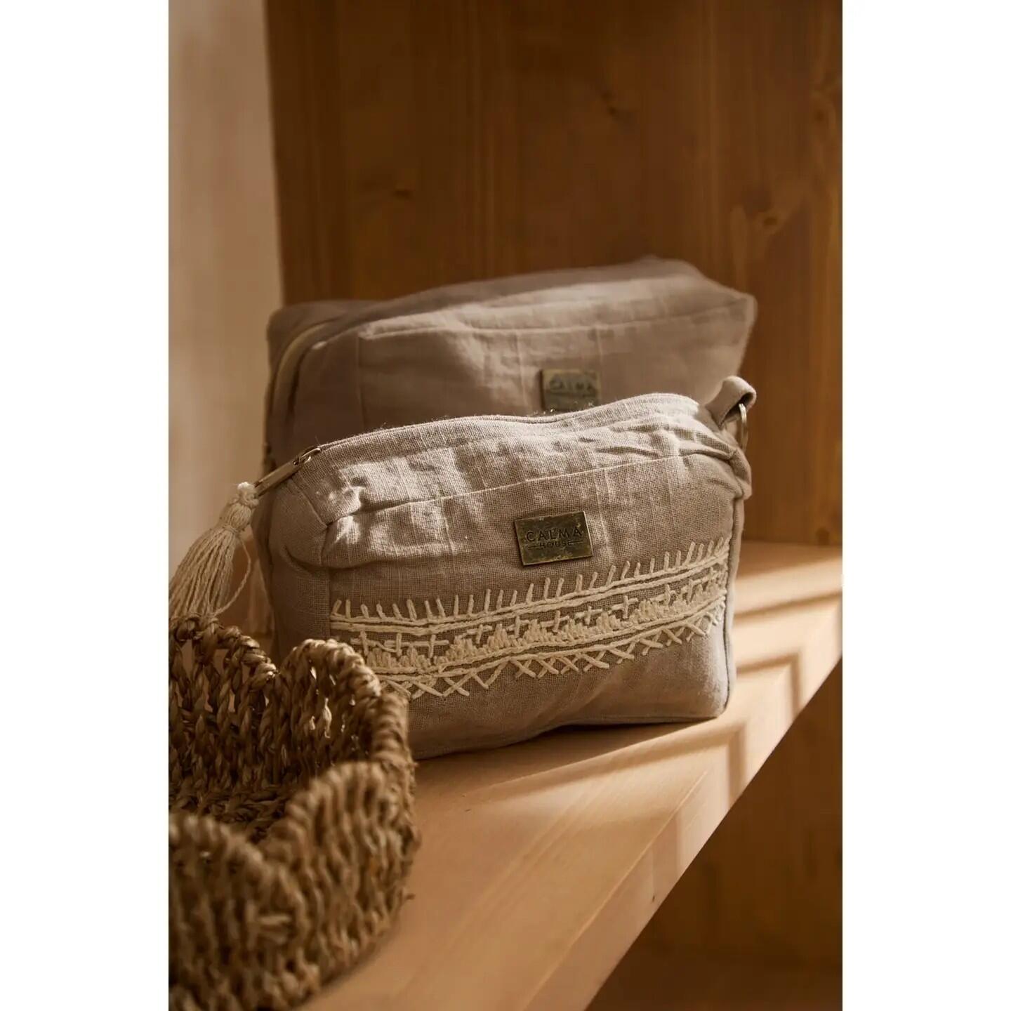 Necessaire in cotone color pietra con ricamo naturale. Chiusura con cerniera e dettaglio pon-pon. Interno resistente all'acqua. Anello laterale per presa.