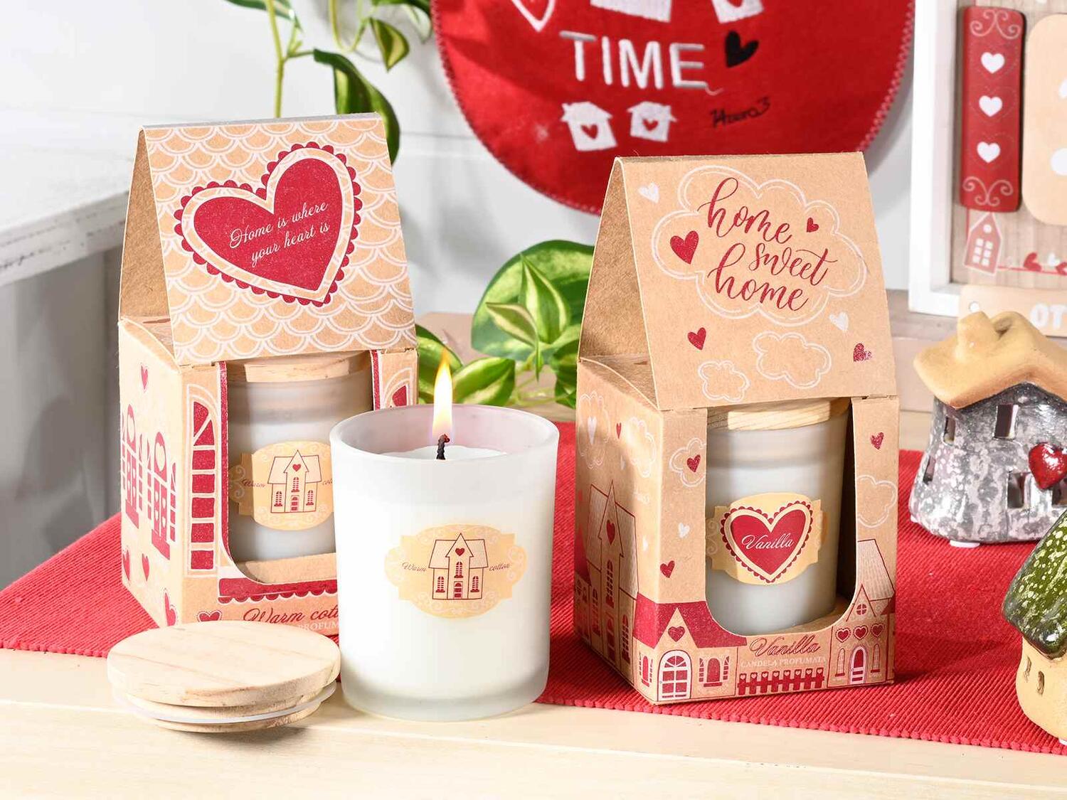 Candele profumate in vasetto di vetro con tappo in legno e confezione regalo a casetta
