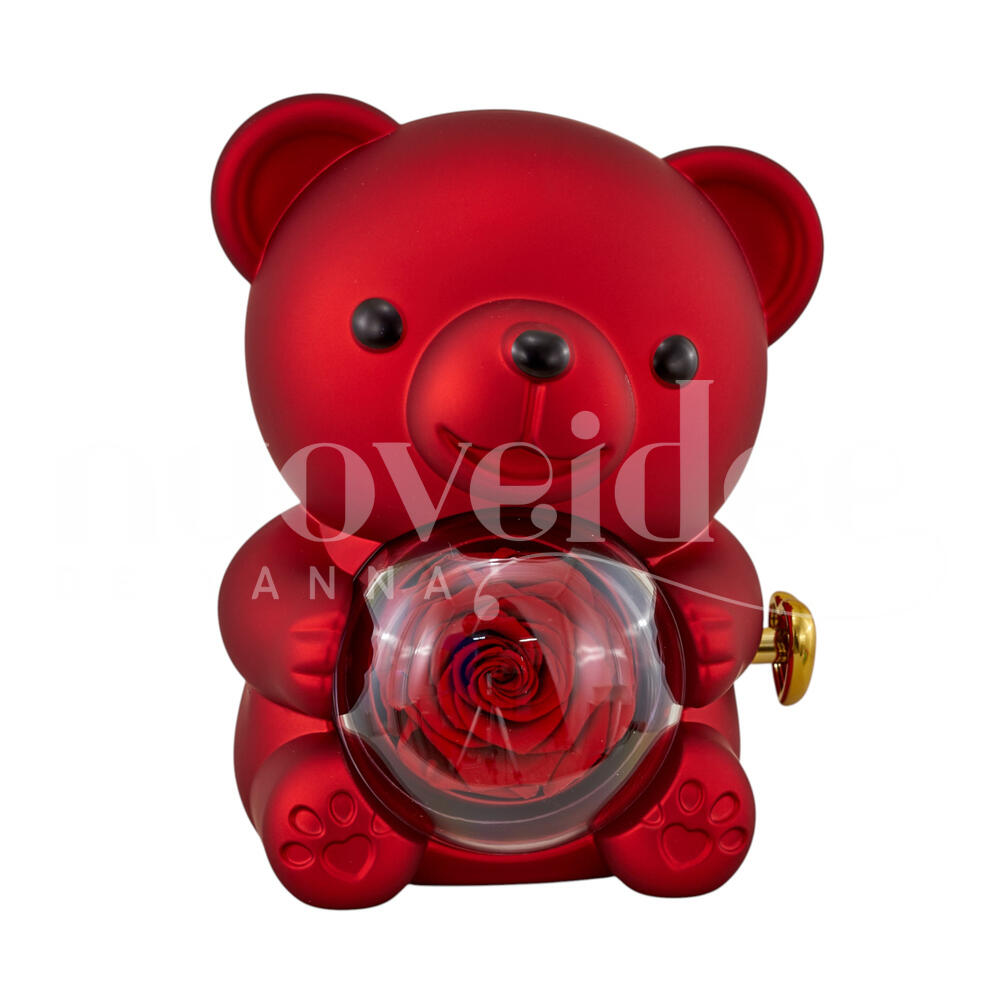 ORSO CON ROSA STABILIZZATA E COLLANA CUORE SCATOLA ROTANTE H 13 CM ROSSO
